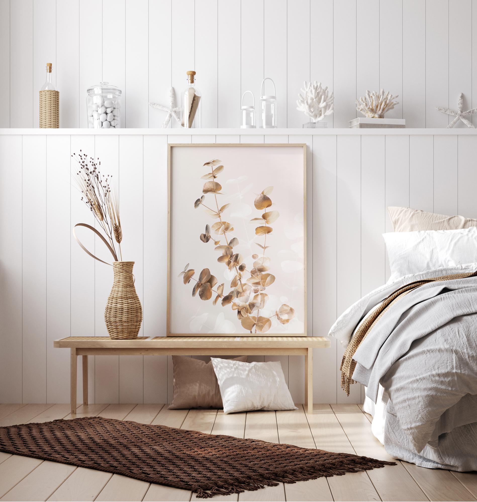 Μια υπέροχη αφίσα με κλαδιά χρυσού ευκαλύπτου. Τα χρυσαφένια και καφέ φύλλα είναι απαλά καθώς προεξέχουν από το λευκό φόντο. Τα φύλλα είναι στρογγυλά, δημιουργώντας όμορφες μορφές στην εικόνα. Αυτή η αφίσα προσφέρει μια ήρεμη και κομψή αίσθηση στο σπίτι σας.