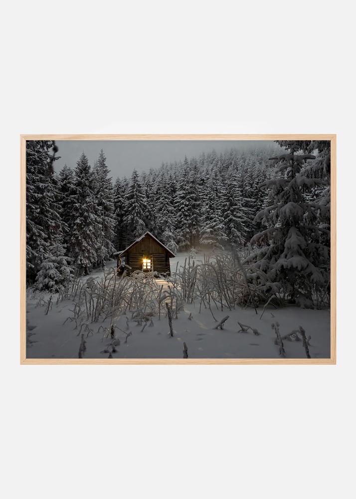 Αφίσα με ένα χαριτωμένο μικρό ξύλινο σπίτι στολισμένο για το χειμώνα, βαθιά μέσα στο έλατο δάσος. Το φως από το παράθυρο που φωτίζει την παγωμένη χειμωνιάτικη νύχτα δίνει στο φωτογραφία βάθος και κάνει τον πίνακα ενδιαφέρον. Η εικόνα ταιριάζει σε όλα τα στυλ διακόσμησης και περιβάλλοντα. Είναι εξίσου ωραία σε ένα λεπτό μαύρο μεταλλικό πλαίσιο όσο και σε μια πιο στερεή παραλλαγή από ξύλο, ή γιατί να μην πάρετε το φως της εικόνας σε ένα κλασικό χρυσό πλαίσιο.