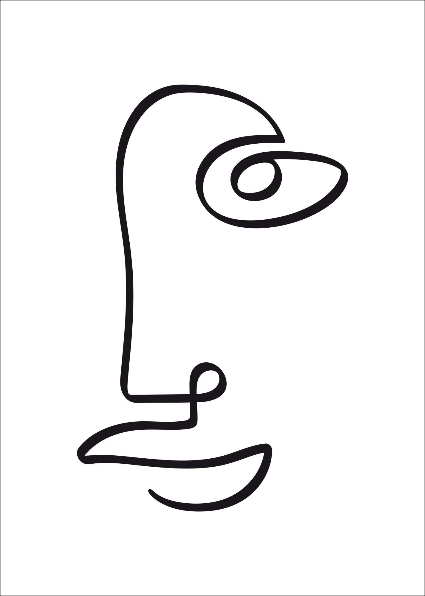 Μια αφηρημένη αφίσα με ένα πρόσωπο, σχεδιασμένη με μια μαύρη γραμμή. Η απλή μαύρη γραμμή στρίβει στην εικόνα για να δημιουργήσει τη μία πλευρά ενός προσώπου χωρίς να φύγει ούτε μία φορά από το χαρτί. Σκεφτείτε αυτήν την απλή εικόνα όταν την κρεμάτε στο σπίτι και προσπαθήστε να δείτε άλλες μορφές κρυμμένες στο έργο.