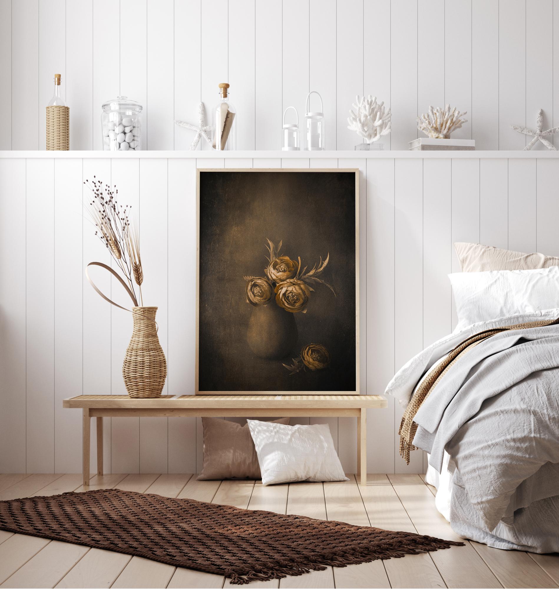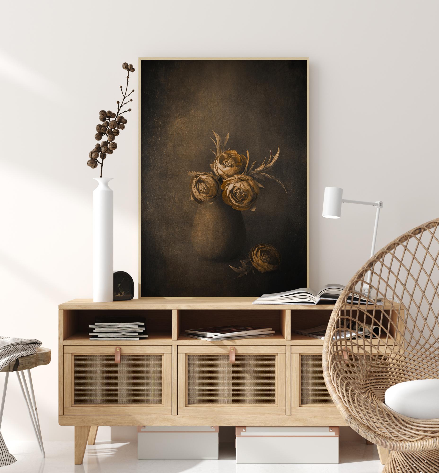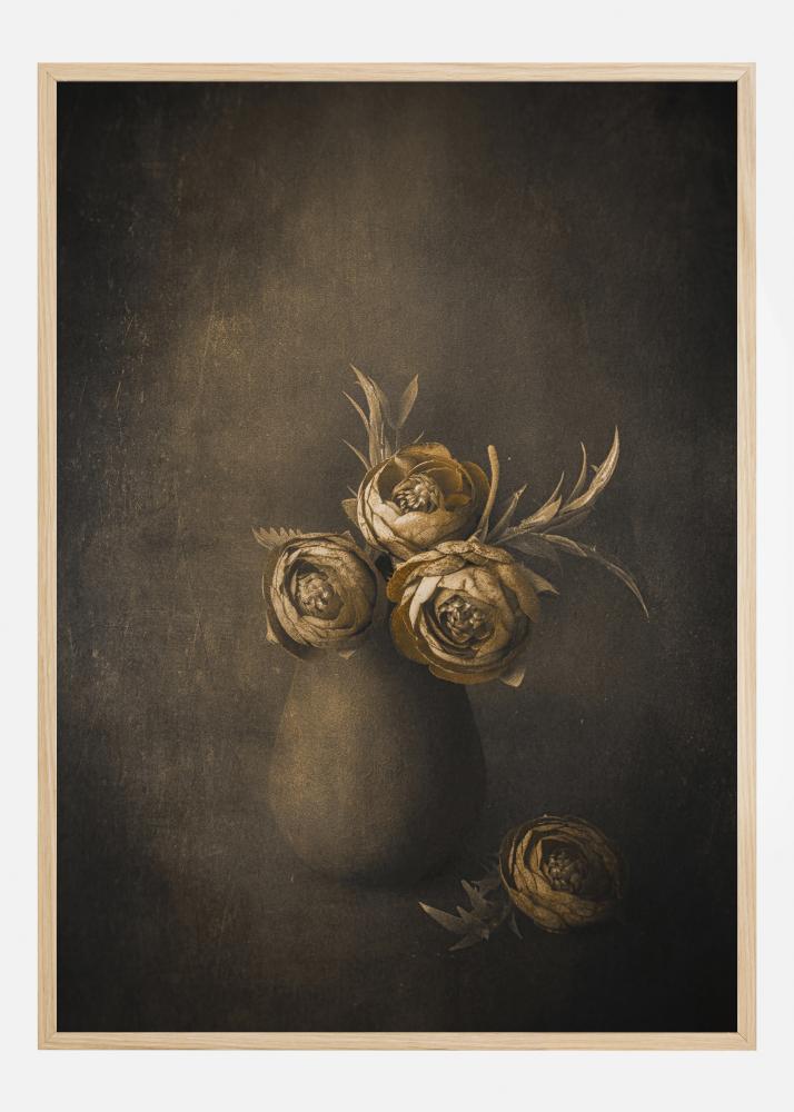 Μια αφίσα νεκρής φύσης με χρυσά λουλούδια σε πήλινο κανάτι με σκούρο φόντο. Τα λαμπερά χρυσοκίτρινα λουλούδια ξεχωρίζουν έναντι του σκοτεινότερου καφέ τοίχου στον πίνακα. Συνδυάστε αυτήν με έναν τοίχο στο χρώμα της κρέμας για να αναδείξετε τα λουλούδια σε άλλο επίπεδο.