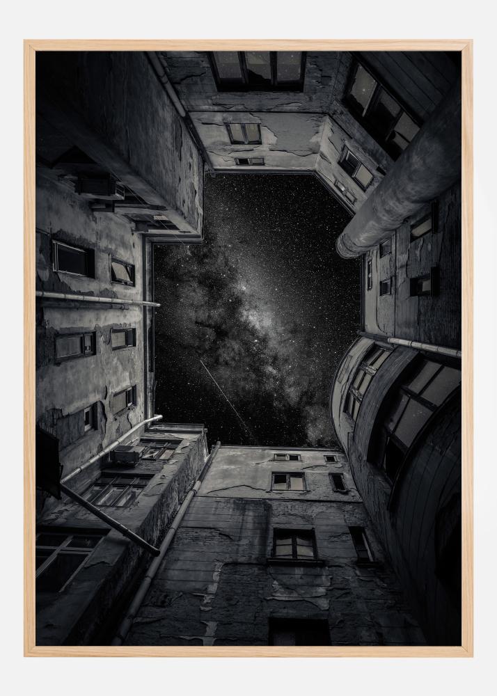 Η αφίσα συνδυάζει την αρχιτεκτονική ομορφιά της πόλης με τη φυσική ομορφιά του κοσμικού, δημιουργώντας μια υποβλητική αντίθεση μεταξύ του αστικού και του παγκόσμιου. Ο μονοχρωματικός χρωματισμός με τις αποχρώσεις μαύρου, λευκού και γκρι καθιστά την εικόνα εύκολη να ενσωματωθεί σε διάφορα στυλ εσωτερικής διακόσμησης και θα ήταν ένα ενδιαφέρον σημείο συζήτησης σε οποιοδήποτε δωμάτιο.