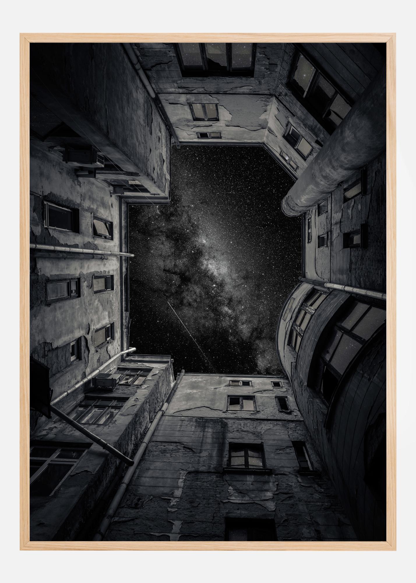 Αυτή η φωτογραφία προσφέρει μια μοναδική προοπτική εικόνα που τραβά την προσοχή του θεατή προς τα πάνω κατά μήκος των παλιών προσόψεων των κτιρίων προς έναν έναστρο ουρανό. Οι σκοτεινές αποχρώσεις και υφές στα κτίρια δίνουν μια αίσθηση ιστορίας και περάσματος του χρόνου, ενώ τα αστέρια από πάνω προσδίδουν μια αίσθηση αιωνιότητας και απεραντοσύνης.