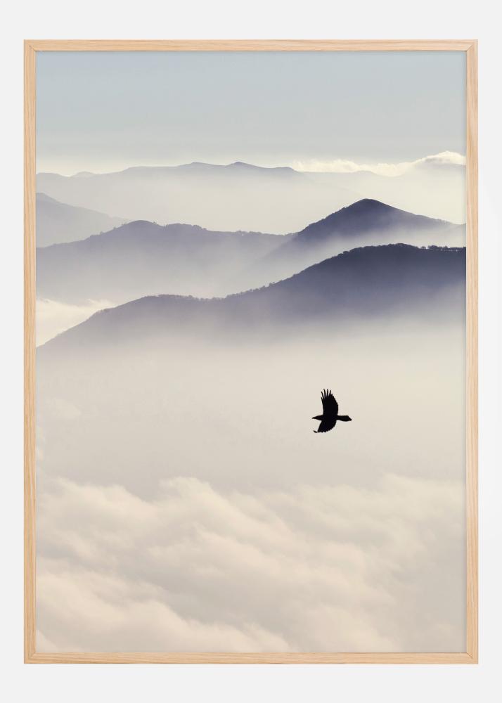 Αυτή η αφίσα εμπνευσμένη από τη φύση αποτυπώνει μια απλή, αλλά ισχυρή εικόνα ελευθερίας και σιωπής. Ένα μοναχικό πουλί πετάει μεγαλοπρεπώς πάνω από μια ομιχλώδη κοιλάδα, με στρώματα βουνών που σιγά-σιγά εξαφανίζονται στο απαλό φως της αυγής ή του σούρουπου. Οι απαλές αποχρώσεις και το μινιμαλιστικό τοπίο προσφέρουν μια αίσθηση ηρεμίας και απεριόριστης ελευθερίας.