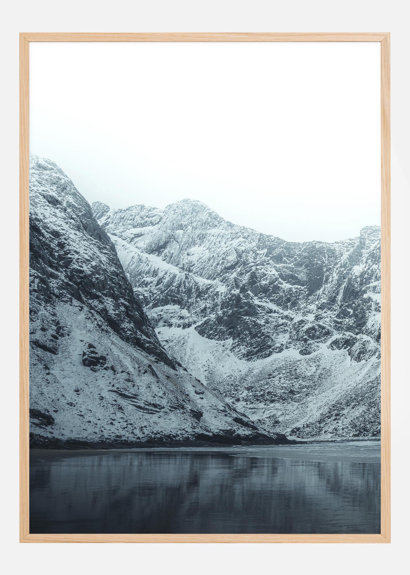 Μια δραματική αφίσα με χιονισμένα βουνά που οδηγούν προς ένα ήρεμο νερό. Μια λίμνη ή ίσως ένα φιόρδ εκτείνεται προς τα χιονισμένα βουνά και τα συναντά στο προσκήνιο. Ένας φωτεινός λευκός ουρανός βοηθά στη δημιουργία μιας αίσθησης χειμώνα. Φέρτε τον κρύο καιρό σε εσωτερικούς χώρους όταν κρεμάσετε αυτή την εικόνα.