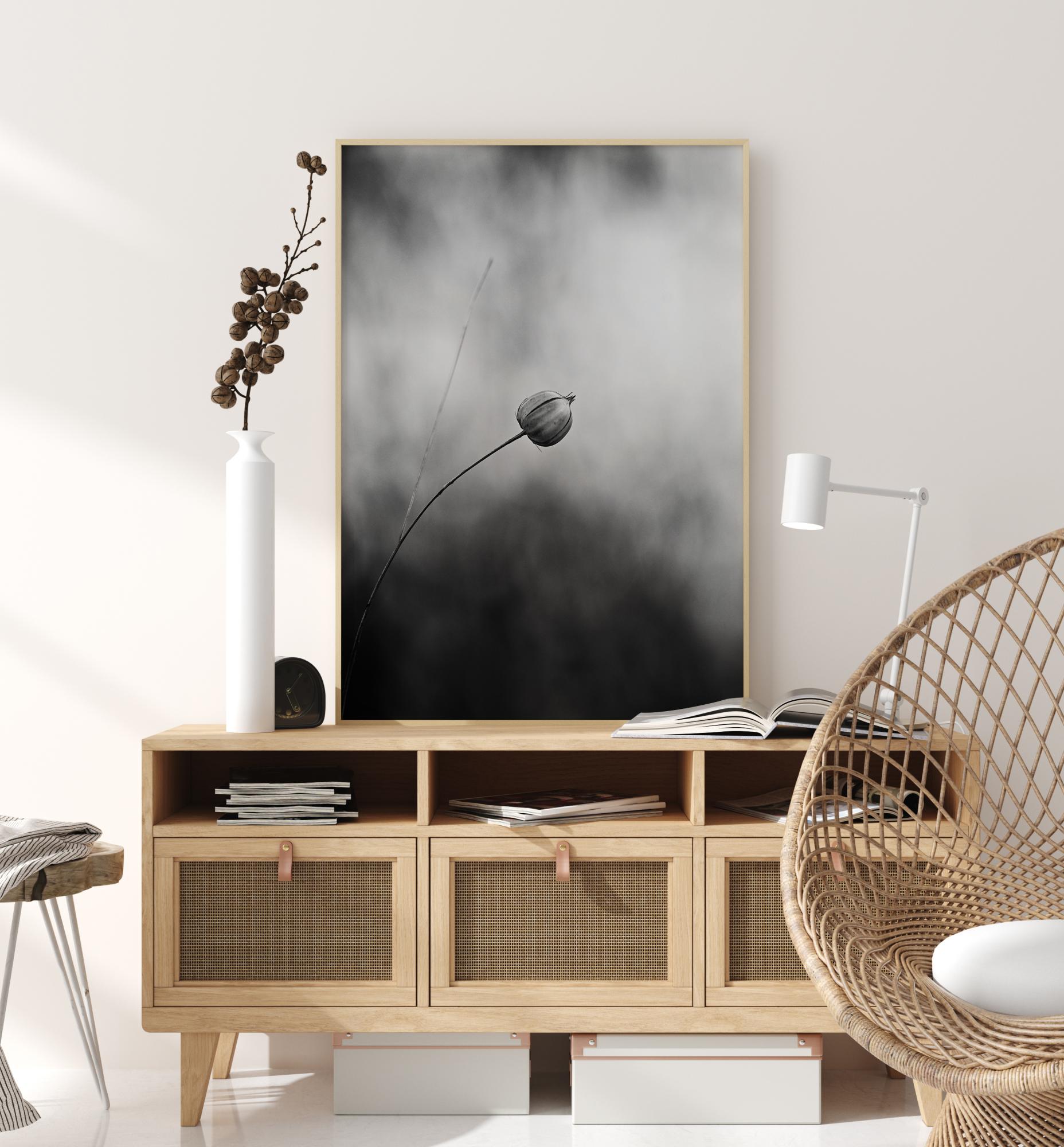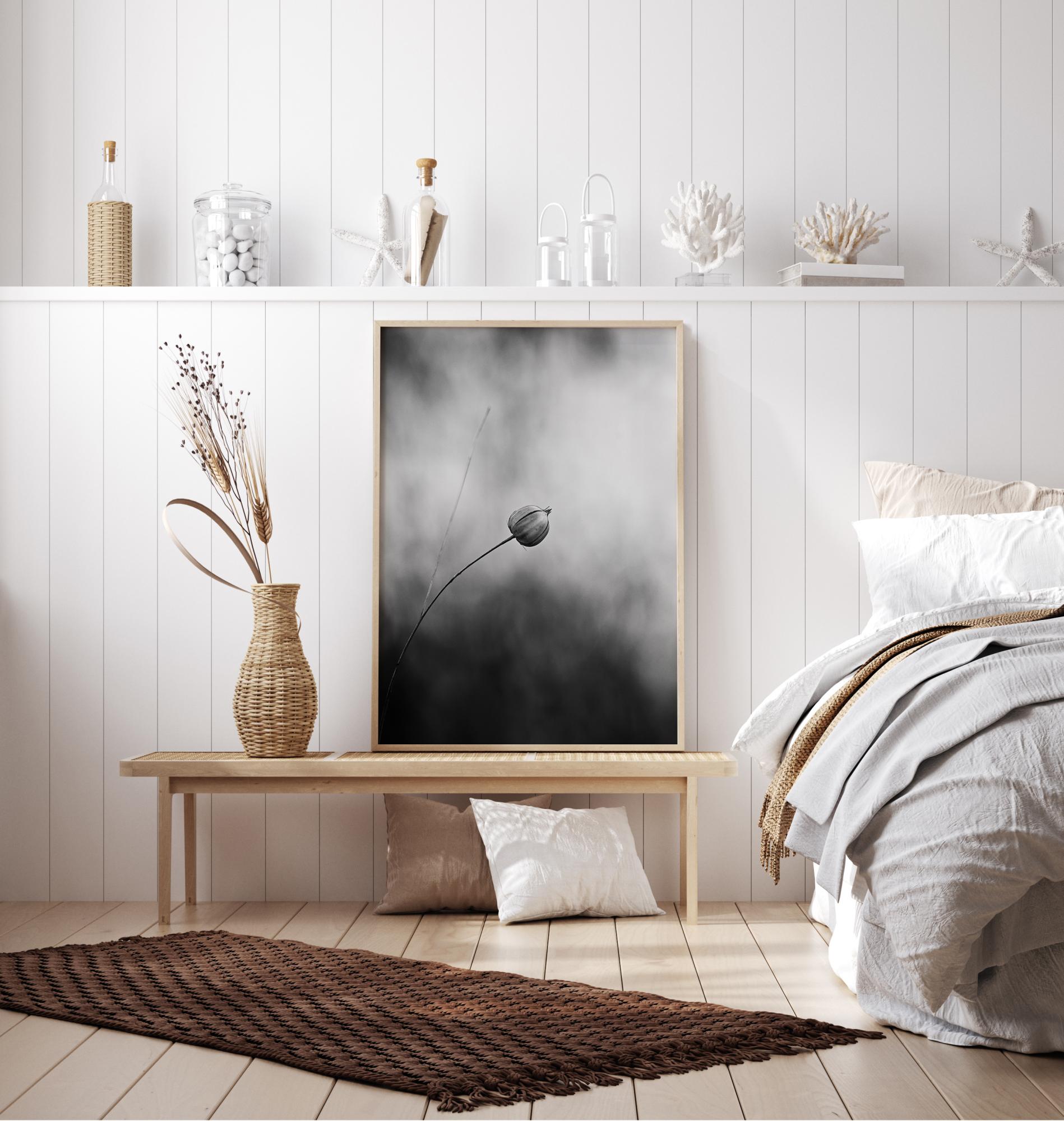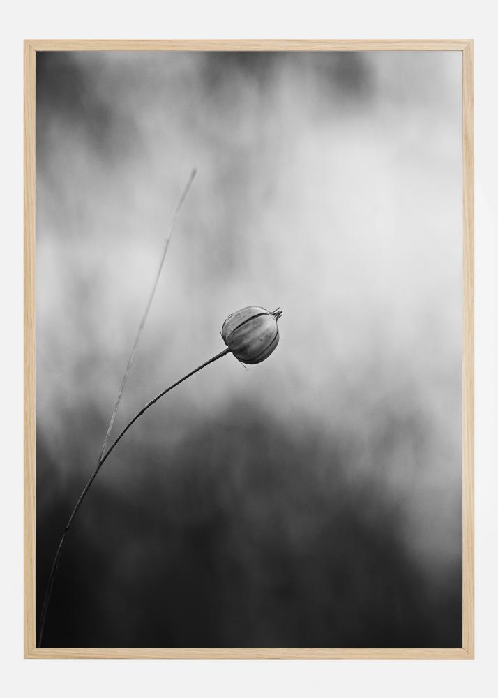 Μια ασπρόμαυρη αφίσα με ένα μόνο λινάρι αφού έχει ανθίσει. Το λινάρι κάμπτεται προς το κέντρο της εικόνας, διακρινόμενο καθαρά στο λευκό φως. Κάτω από αυτό, το φόντο είναι σκούρο και εκτός εστίασης για να διατηρήσει την προσοχή στο μοναδικό άνθος. Δώστε χρώμα σε αυτό το έργο με έναν βαμμένο τοίχο.