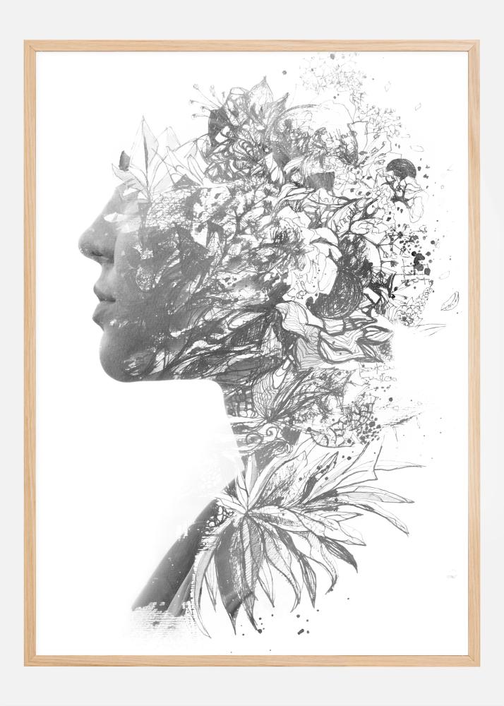 Αυτή η καλλιτεχνική αφίσα συνδυάζει το προφίλ μιας γυναίκας με μια λεπτομερή και περίπλοκη εικονογράφηση λουλουδιών και φυτών, δημιουργώντας μια συναρπαστική συγχώνευση ανθρώπινης μορφής και των λεπτών λεπτομερειών της φύσης. Η ασπρόμαυρη χρωματική παλέτα προσδίδει μια διαχρονική αίσθηση και αναδεικνύει την υποβλητική υφή και την πολυπλοκότητα τόσο της ανθρώπινης φιγούρας όσο και των λουλουδάτων μοτίβων.