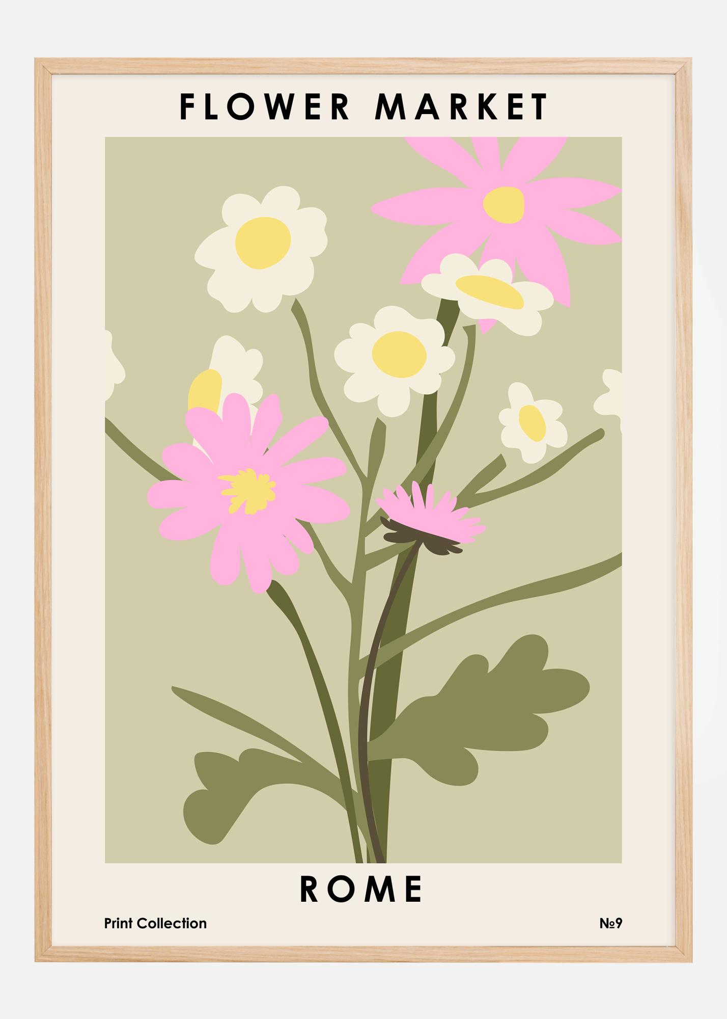 Με έναν φωτεινό και φιλόξενο σχεδιασμό, αυτή η αφίσα απεικονίζει τη ζεστή και ζωντανή ατμόσφαιρα μιας αγοράς λουλουδιών στη Ρώμη. Η πλούσια λεπτομέρεια και η παιχνιδιάρικη χρήση χρωμάτων είναι στο επίκεντρο, με μεγάλα ροζ λουλούδια που συμπληρώνονται από ευαίσθητα λευκά άνθη, όλα σε ένα φόντο με μια ηρεμιστική απόχρωση ελαιόλαδου. Αυτή η εκτύπωση είναι τέλεια για να εισαγάγετε μια αίσθηση της αιώνιας πόλης της Ρώμης και της αγάπης της για την ομορφιά και τη φύση στον χώρο σας.