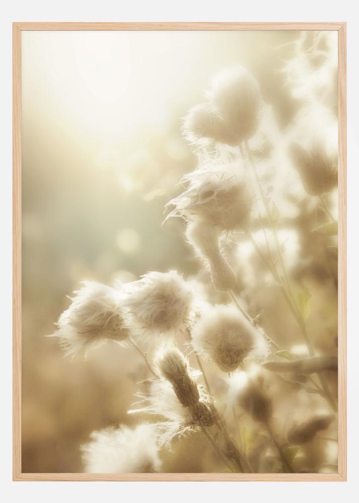 Μια μαγική αφίσα με αφράτα λουλούδια στο πρώιμο πρωινό φως. Οι μαλακές μπάλες στα λουλούδια φωτίζονται από το πρωινό φως που δημιουργεί φωτοστέφανα αγγέλων γύρω από κάθε λουλούδι. Τα απαλά παστέλ χρώματα βοηθούν να δημιουργηθεί μια υπνηλία, μαγική αίσθηση ενός απαλού ξυπνήματος.