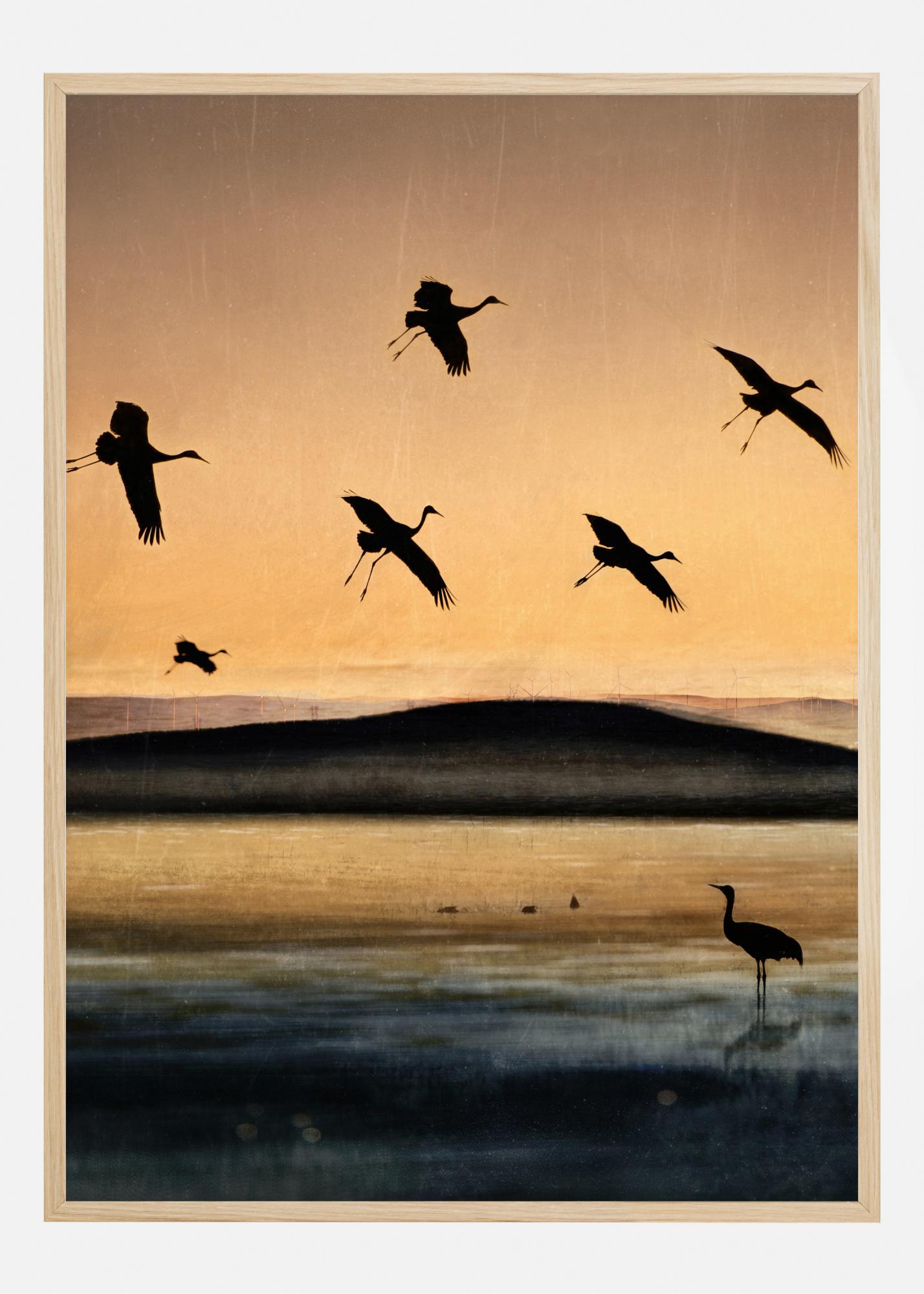 Μια ατμοσφαιρική αφίσα με πουλιά που πετούν στο ηλιοβασίλεμα. Έξι πελαργοί παίρνουν πτήση, οι σιλουέτες τους σε έντονη αντίθεση με έναν πορτοκαλί ουρανό και τον κατερχόμενο ήλιο. Ένα μοναχικό πουλί στέκεται στη μπλε και χρυσή λίμνη και κοιτάζει προς τα πάνω τους υπόλοιπους καθώς πετούν μακριά. Νιώστε την ειρήνη της πτήσης σε αυτήν τη ζεστή αφίσα.