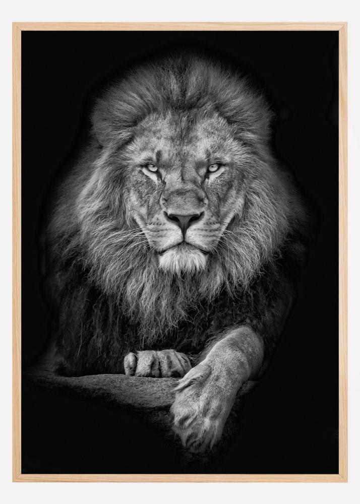 Μια ασπρόμαυρη κοντινή φωτογραφία ενός λιονταριού που κοιτάζει κατευθείαν τον θεατή. Το σκοτεινό φόντο και η έντονη ματιά δημιουργούν μια υπέροχη έλξη προς τον πίνακα. Αυτή η αφίσα είναι εξίσου καλή ανεξάρτητα ή σε συνδυασμό με άλλες αγαπημένες σε ένα μεγαλύτερο κολάζ.