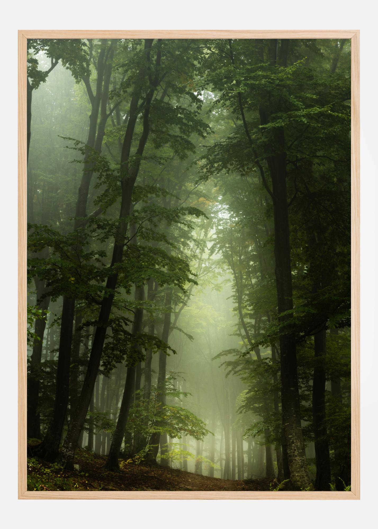 Αυτή η ατμοσφαιρική αφίσα σε προσκαλεί να χαθείς σε ένα δάσος καλυμμένο από ομίχλη, όπου κάθε δέντρο φαίνεται να αφηγείται τη δική του ιστορία. Το απαλό νέφος που περιβάλλει τους ανθεκτικούς κορμούς των δέντρων και το ζωντανό πράσινο φύλλωμα δημιουργούν μια ονειρική σκηνή που μοιάζει να έχει προέλθει από έναν άλλο κόσμο. Το απαλό φως που φιλτράρει μέσα από το φύλλωμα προσθέτει μια αίσθηση μυστικισμού και ηρεμίας.