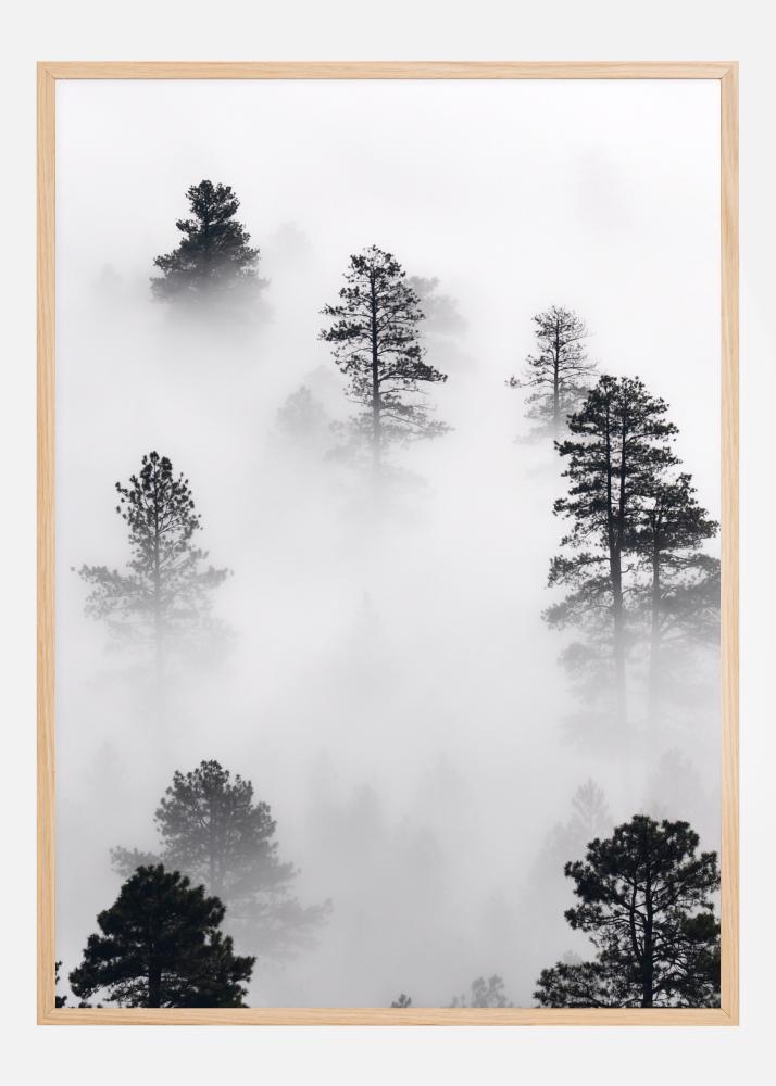 Ένα φανταστικό πόστερ τοπίου με ένα δάσος στην ομίχλη. Ψηλές σκοτεινές κορυφές δέντρων ξεπροβάλλουν από την απαλό λευκή ομίχλη, δημιουργώντας μια ισχυρή αντίθεση μεταξύ ομίχλης και δέντρων. Φέρτε την αίσθηση του κρύου χειμώνα στο σπίτι σας όταν το κρεμάσετε σε έναν ουδέτερο τοίχο.