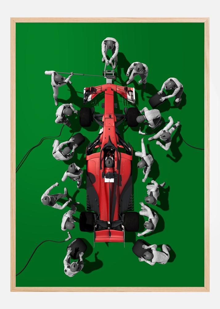 Το ζωντανό πράσινο φόντο όχι μόνο ενισχύει την εστίαση στις λεπτομερείς γκρίζες και λευκές στολές των μηχανικών, αλλά και στο εντυπωσιακό κόκκινο χρώμα του αγωνιστικού αυτοκινήτου. Αυτή η αφίσα αποτυπώνει τη στιγμή της συγκεντρωμένης προσοχής και ταχύτητας που καθορίζει κάθε αγώνα, καθιστώντας την τέλειο προσθήκη για όλους όσους αγαπούν την ταχύτητα και τον ήχο των κινητήρων των αγωνιστικών αυτοκινήτων. Η τολμηρή παλέτα χρωμάτων της αφίσας της δίνει την ενέργεια και τη δύναμη να είναι το κέντρο οποιουδήποτε δωματίου όπου κι αν εμφανίζεται.