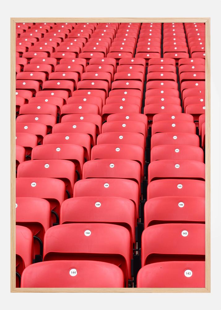 Η αντίθεση μεταξύ των ζωηρών κόκκινων καθισμάτων και των λευκών αριθμών καθώς και το διακριτικό παιχνίδι των σκιών προσφέρει μια ισχυρή οπτική επίδραση που συμπληρώνει κάθε στυλ διακόσμησης. Τα χρώματα της εκτύπωσης, κυριαρχούμενα από το κόκκινο και το λευκό, είναι απλά αλλά τολμηρά και έχουν την ικανότητα να προσθέτουν ζωή και ενέργεια στο δωμάτιο. Είτε τοποθετηθεί σε ένα σαλόνι, σε ένα γραφείο ή σε έναν αθλητικό χώρο, αυτή η αφίσα θα εμπνεύσει και θα θυμίσει τις αξέχαστες στιγμές που μοιράζονται σε μεγάλες αρένες σε όλο τον κόσμο.