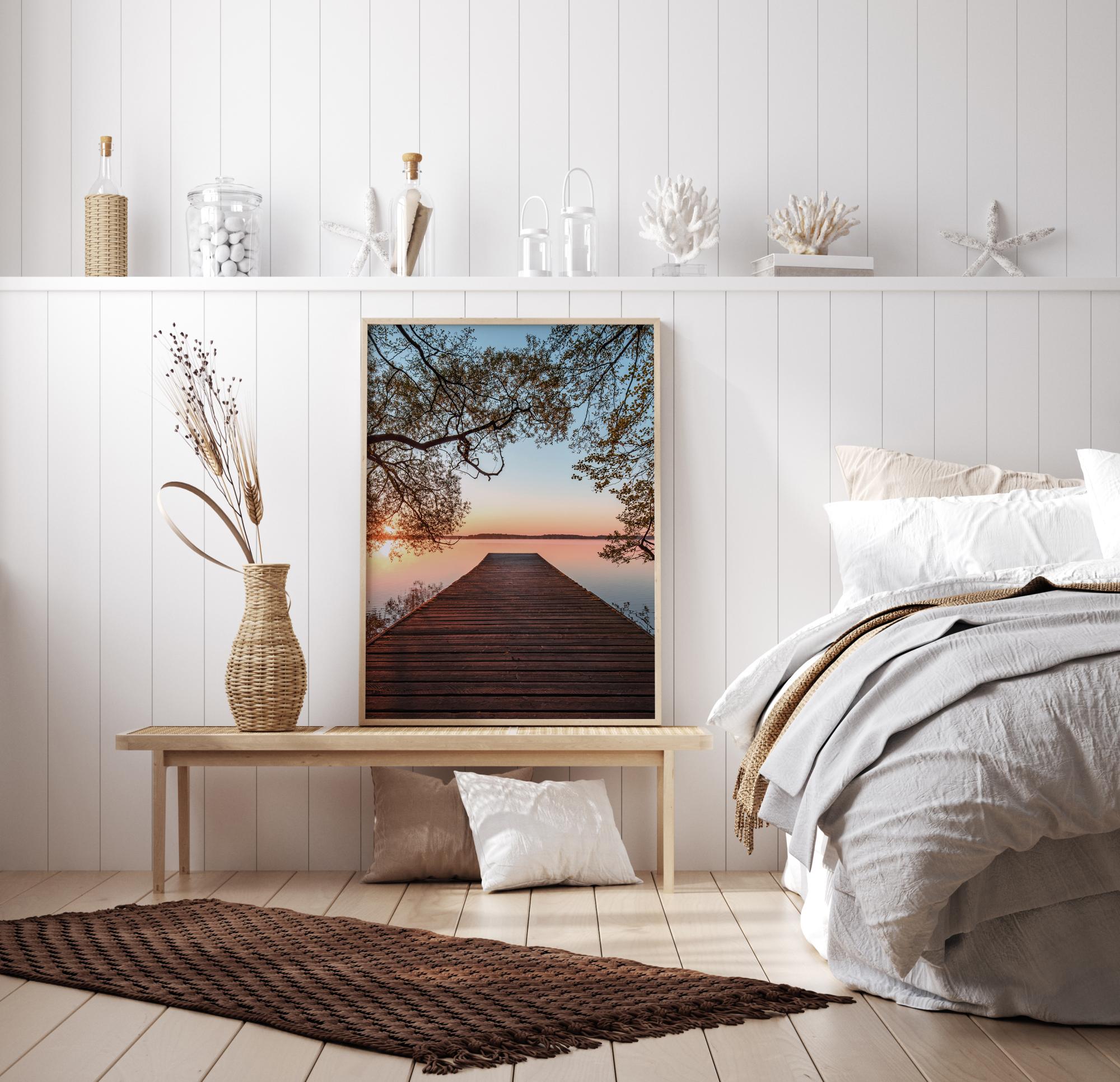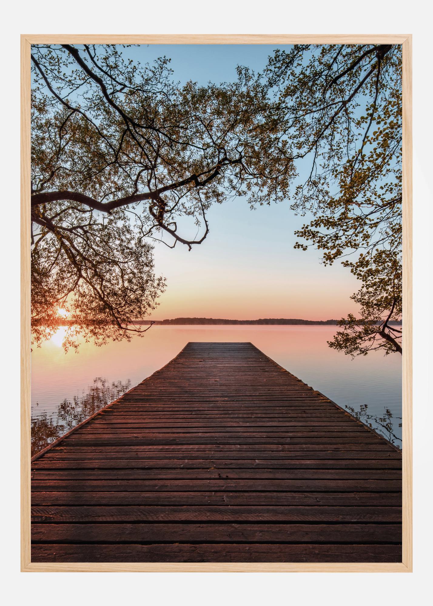 Μια ατμοσφαιρική αφίσα με μια αποβάθρα που προχωρά πάνω από μια λίμνη σε μια φωτεινή μέρα. Κλαδιά δέντρων πλαισιώνουν την αποβάθρα που οδηγεί προς τη λίμνη και τον ουρανό, με απαλό μπλε και ροδάκινο χρώμα. Αποκτήστε μια αίσθηση ελευθερίας όταν τη φέρετε σπίτι.