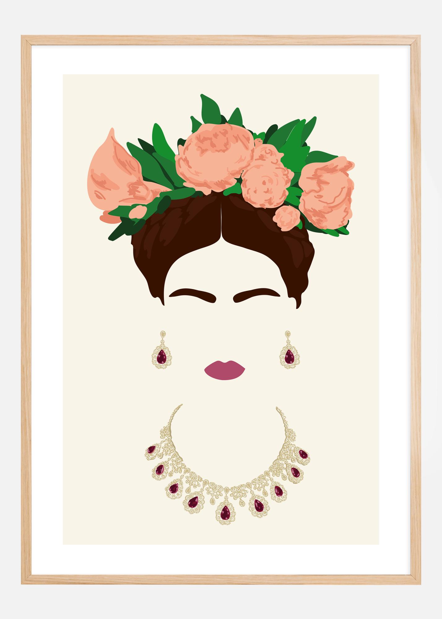 Σε αυτά προστίθενται διακοσμητικές λεπτομέρειες όπως χρυσά σκουλαρίκια με βυσσινί πολύτιμους λίθους και ένα αντίστοιχο στολισμένο κολιέ που ολοκληρώνει τη σύνθεση. Αυτή η αφίσα είναι ένας φόρος τιμής τόσο στην παραδοσιακή ομορφιά όσο και στη σύγχρονη σχεδίαση, καθιστώντας την μια ισχυρή δήλωση σε κάθε δωμάτιο. Η αισθητική της συνδυάζει ζεστούς τόνους και απλά γραφικά για να δημιουργήσει μια φιλόξενη και ατμοσφαιρική καλλιτεχνική εμπειρία.