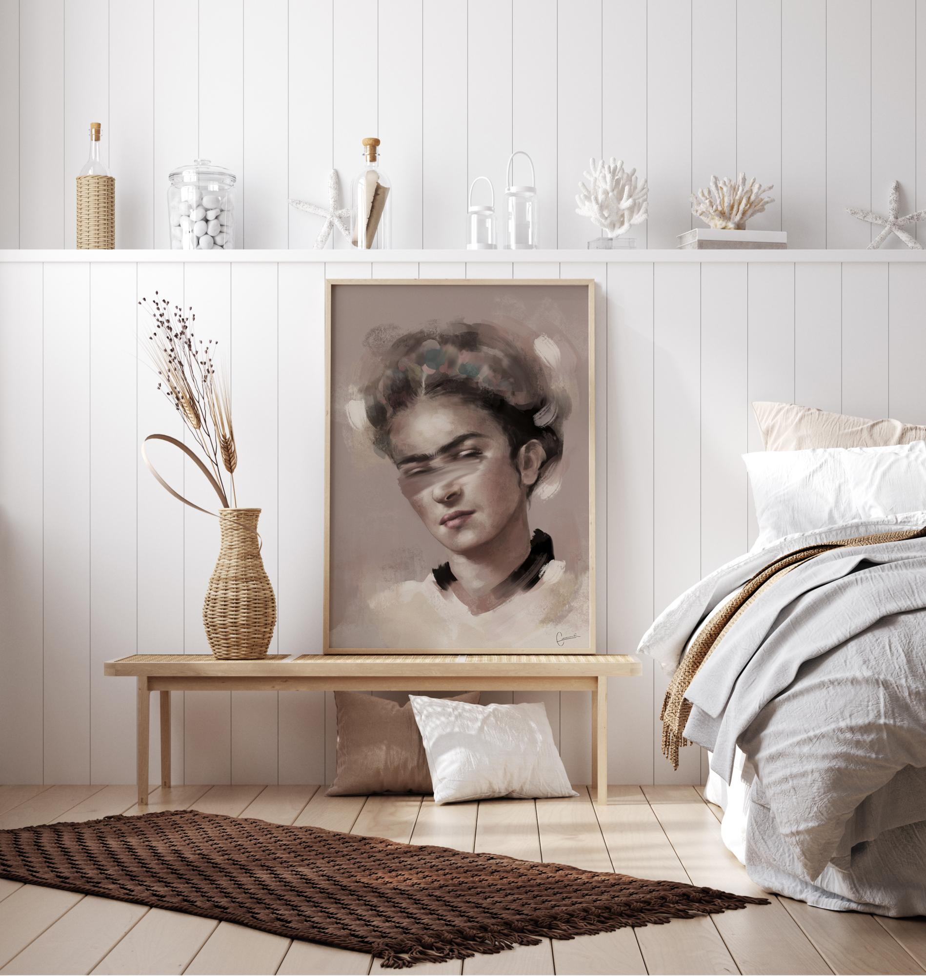 Μια αφίσα πορτρέτου με τη Frida Kahlo σε απαλές αποχρώσεις. Ειρηνική και γαλήνια, αυτή η γυναίκα κοιτάζει κάτω με μια ήρεμη έκφραση στο πρόσωπο. Τα μαλλιά και το δέρμα της είναι σε απαλούς ουδέτερους τόνους που συμβάλλουν στη σχεδόν αγγελική αίσθηση που αποπνέει. Δείξε τον αγαπημένο σου καλλιτέχνη με αυτή την εκτύπωση.