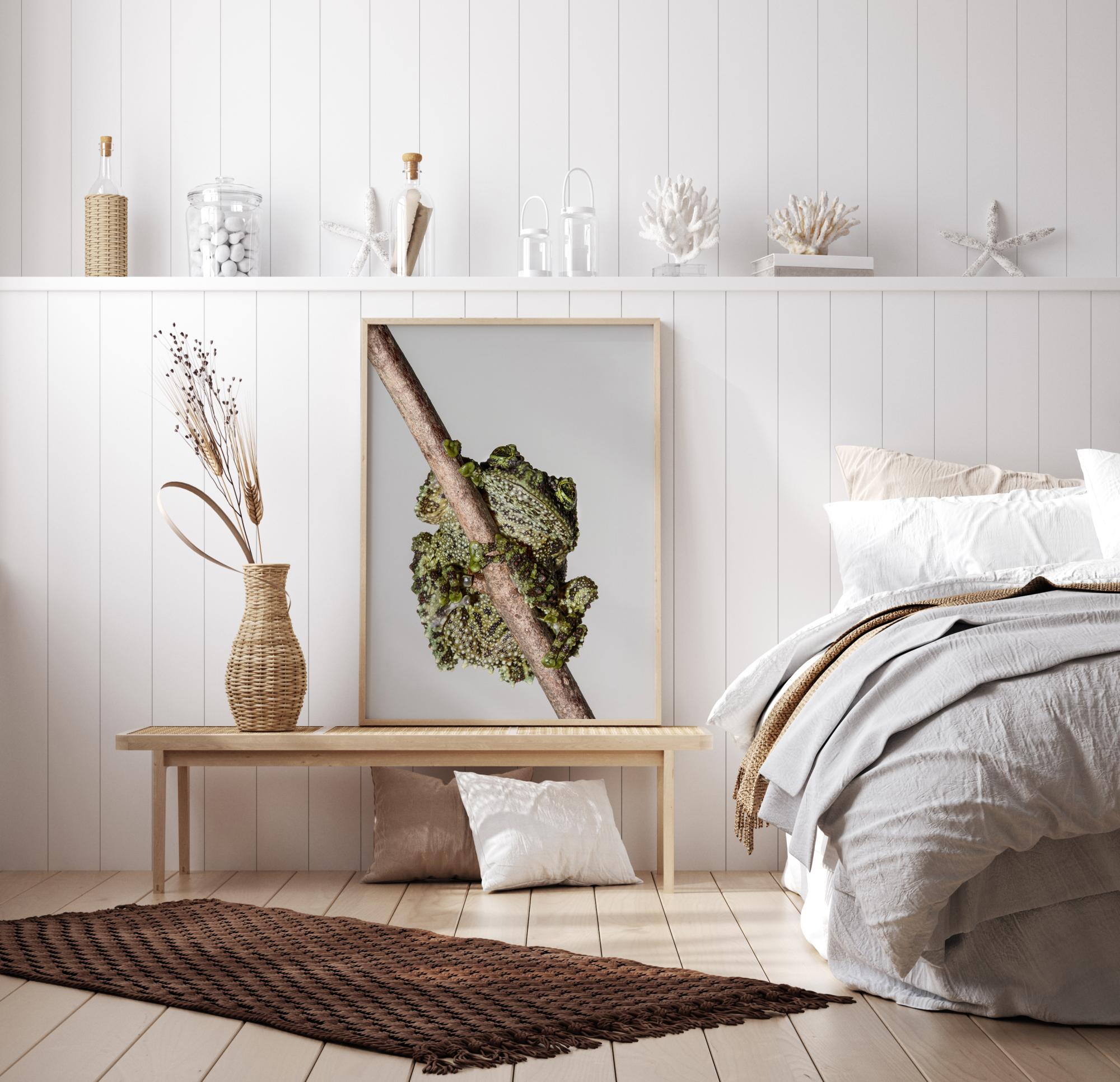 Μια αφίσα μακροφωτογραφίας με έναν βάτραχο σε ένα δέντρο ενάντια σε έναν απαλό γαλάζιο ουρανό. Οι λεπτομέρειες όλων των εξογκωμάτων και των κονδυλωμάτων του βατράχου φαίνονται καθαρά καθώς κρατιέται από το λεπτό κλαδί. Τα μάτια και το στόμα κοιτούν πάνω από το κλαδί σε μια χαριτωμένη και αξιολάτρευτη εικόνα που θα ταίριαζε σε οποιονδήποτε τοίχο.