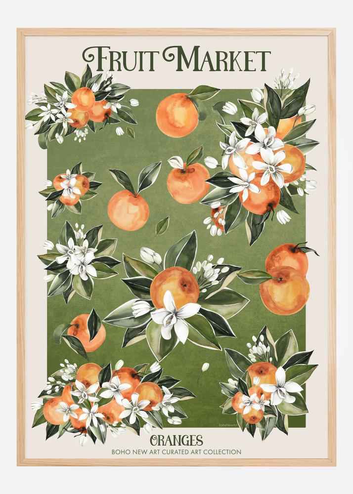 Το φόντο σε βαθύ ελαιοπράσινο χρώμα συμπληρώνει τους ζωηρούς πορτοκαλί τόνους των φρούτων και το απαλό λευκό των πετάλων, προσδίδοντας στο σχέδιο μια αίσθηση φρεσκάδας και φυσικότητας. Η αφίσα ανήκει στη 'Boho New Art Curated Art Collection' και αποτελεί ένα κομψό στοιχείο διακόσμησης που ταιριάζει τέλεια σε μια κουζίνα ή τραπεζαρία, όπου μπορεί να εμπνεύσει γαστρονομικές περιπέτειες ή απλώς να προσθέσει μια αίσθηση καλοκαιριού καθ' όλη τη διάρκεια του χρόνου.