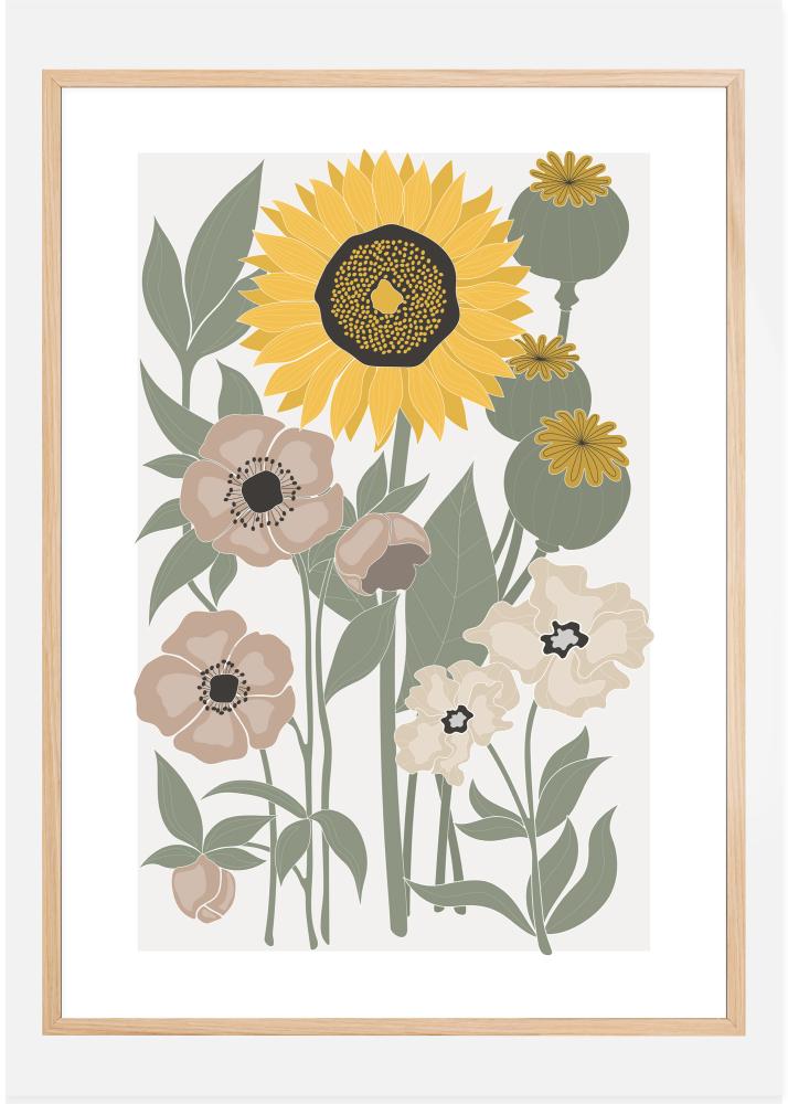 Μια αφίσα με μαλακή υφή με διάφορα λουλούδια. Ένας φωτεινός ηλίανθος κυριαρχεί στο κέντρο της εικόνας μαζί με άλλα λουλούδια όπως παπαρούνες σε αυτήν την αφίσα κήπου. Το απλό στυλ καθιστά εύκολο να δει κανείς τις λεπτομέρειες και να απολαύσει αυτήν την ηλιόλουστη εικόνα.