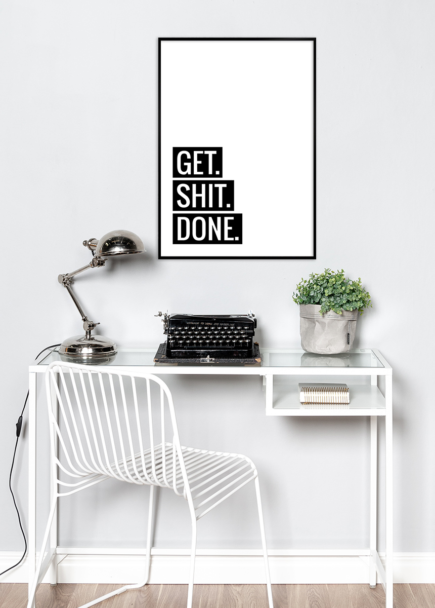 Διακοσμήστε τους τοίχους με απλές και τολμηρές προτροπές! Αυτή η κομψή αφίσα είναι σε λευκό και έχει ένα μαύρο και λευκό τύπωμα με το κείμενο ”GET. SHIT. DONE”. Πιο δύσκολο από αυτό δεν θα έπρεπε να είναι! Ο μινιμαλιστικός σχεδιασμός συνδυάζεται ευχάριστα με τα αγαπημένα σας χρώματα για κορνίζες, πασπαρτού και διάφορα στοιχεία διακόσμησης. Τοποθετήστε την στο γραφείο ή κρεμάστε την πάνω από τον καναπέ! Δεδομένου ότι η αφίσα διατίθεται σε 6 διαφορετικές διαστάσεις, μπορεί να ταιριάξει οπουδήποτε θέλετε να την τοποθετήσετε.