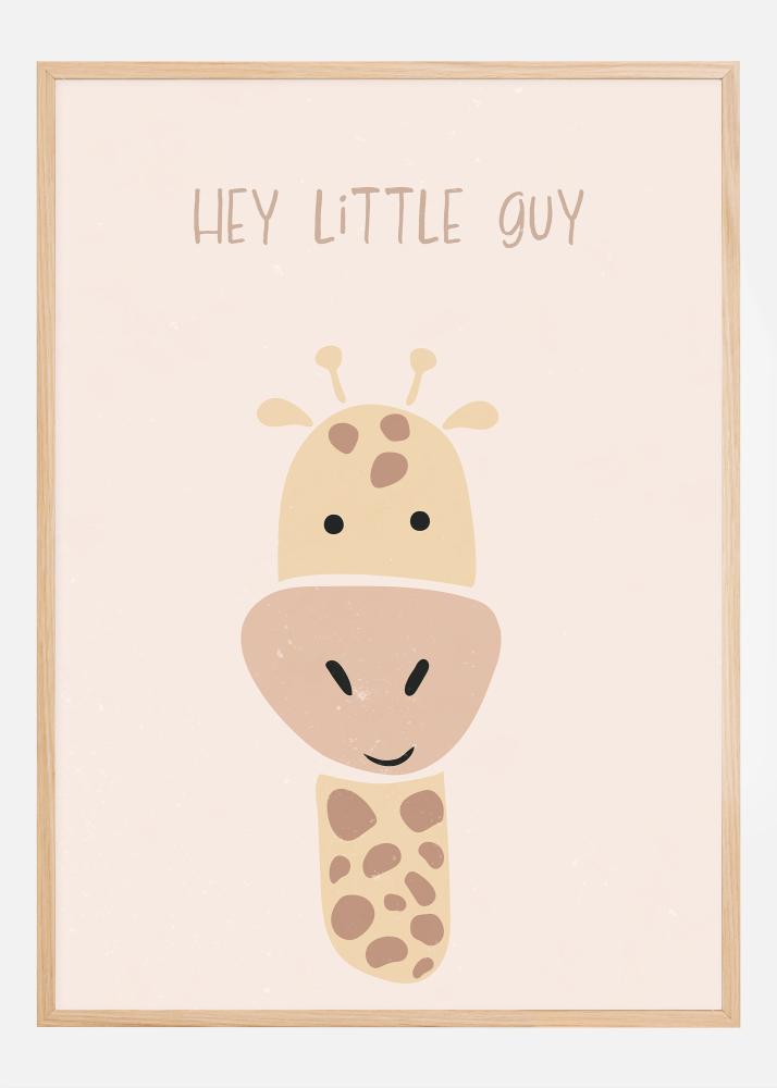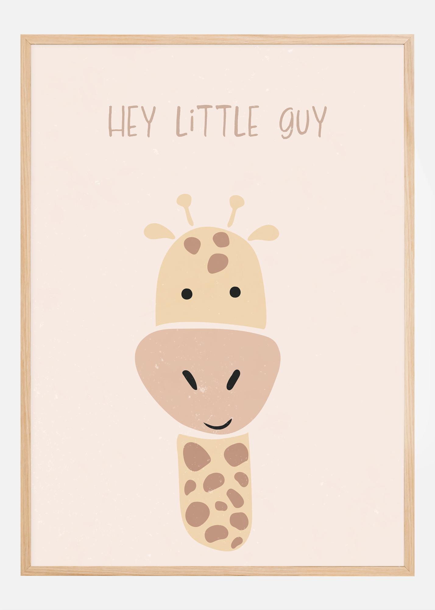 Αυτή η γοητευτική αφίσα με το κείμενο "HEY LITTLE GUY" και μια εικονογράφηση ενός νεογέννητου καμηλοπάρδαλης είναι η τέλεια διακόσμηση τοίχου για ένα παιδικό δωμάτιο ή μια παιχνιδιάρικη πινελιά σε άλλο φωτεινό δωμάτιο. Το μοτίβο χαρακτηρίζεται από απαλές αποχρώσεις όπως το απαλό ροζ στο φόντο και ζεστούς μπεζ και καφέ τόνους στο σχέδιο της καμηλοπάρδαλης. Η σχεδιασμένη καμηλοπάρδαλη, με τον απλό και φιλικό προς τα παιδιά σχεδιασμό της, φέρει ένα μεγάλο χαμόγελο και φιλικά μάτια, δημιουργώντας άμεση σύνδεση και συμβάλλοντας σε μια χαρούμενη και φιλόξενη ατμόσφαιρα.