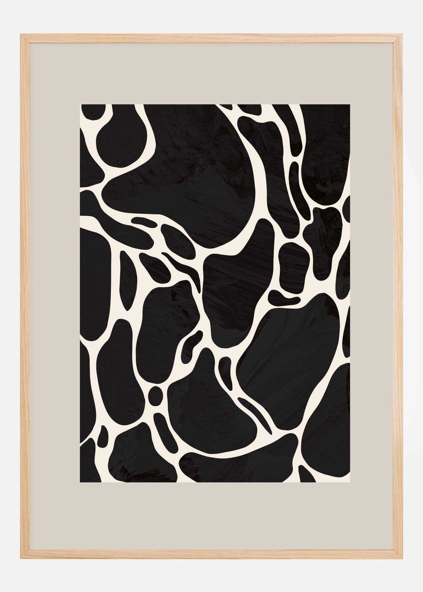 Μια γραφική αφίσα με κηλίδες καμηλοπάρδαλης σε μαύρο και άσπρο. Τα μεγάλα χρωματικά μπλοκ σε μαύρο δημιουργούν μια ελκυστική εικόνα ενώ οι πινελιές σε αυτά προσδίδουν επιπλέον υφή. Οι παχιές λευκές γραμμές διακόπτουν τις κηλίδες της καμηλοπάρδαλης και δημιουργούν ροή και κίνηση στην εικόνα.
