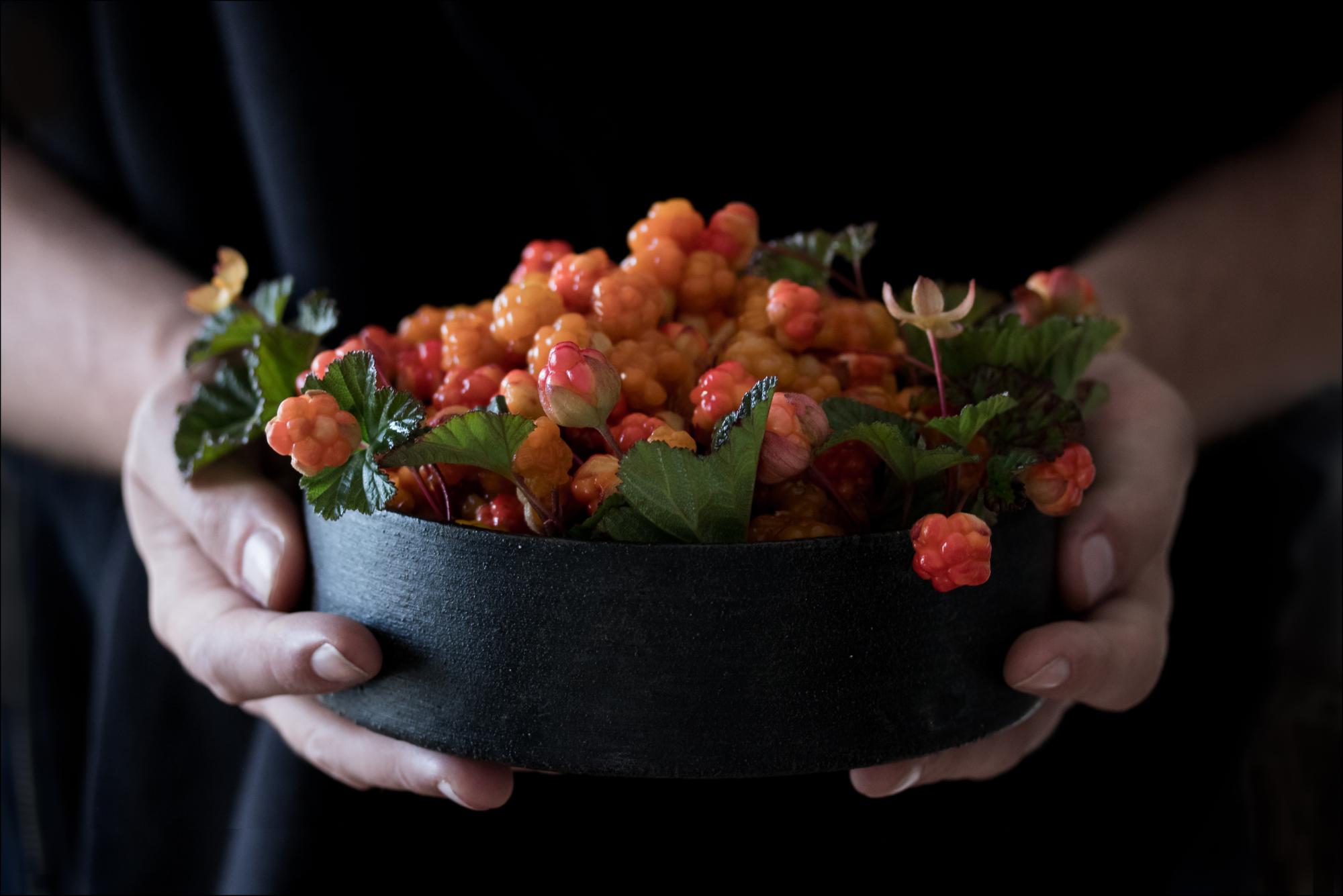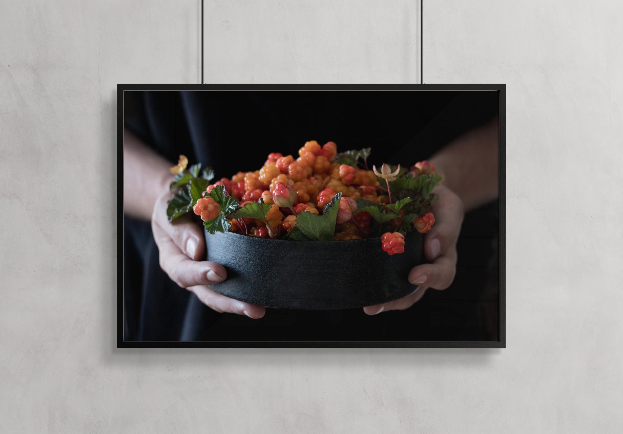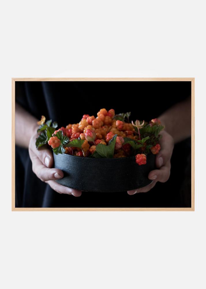 Μια αφίσα φρούτων με χρυσά μούρα που βρίσκονται σε ένα μπολ που κρατούν δύο χέρια. Αυτή η φρέσκια φωτογραφία δείχνει τα χρυσά μούρα και τα φύλλα σε ένα απλό μαύρο μπολ. Δύο χέρια το κρατούν και το προσφέρουν σαν να σκέφτονται να το παραδώσουν σε εσάς αμέσως εκείνη τη στιγμή.