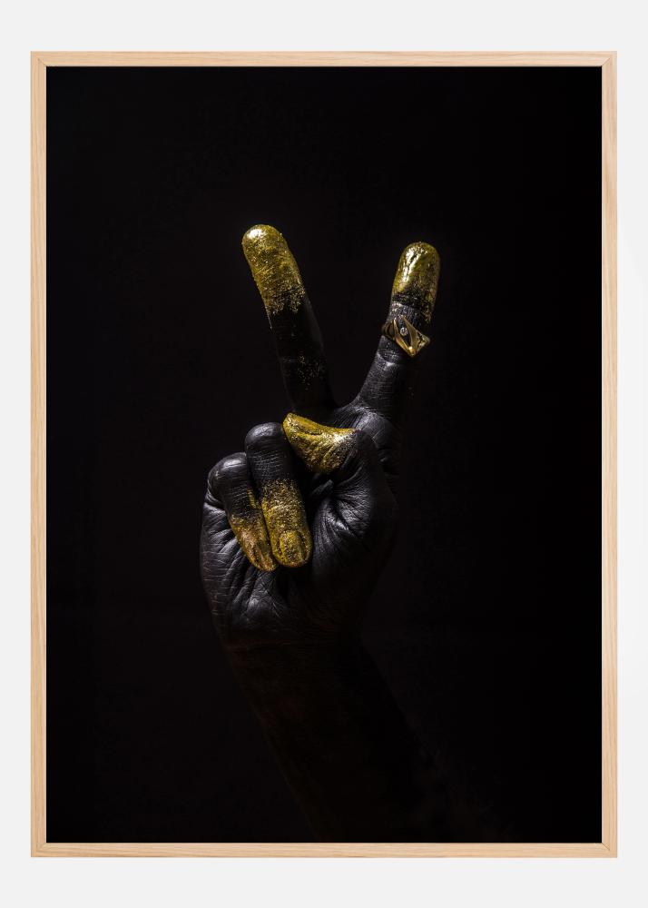 Μια αφίσα αγάπης για την ειρήνη με ένα χέρι που υψώνεται για να κάνει το σύμβολο της ειρήνης. Το μαύρο χέρι είναι σχεδόν αόρατο εναντίον του μαύρου φόντου. Όμως όλα τα δάχτυλα είναι ζωγραφισμένα με χρυσό, ώστε το V των δαχτύλων να ξεχωρίζει καθαρά. Κρατήστε την δροσερή αίσθηση όταν την κρεμάτε σε έναν τοίχο στο σπίτι.