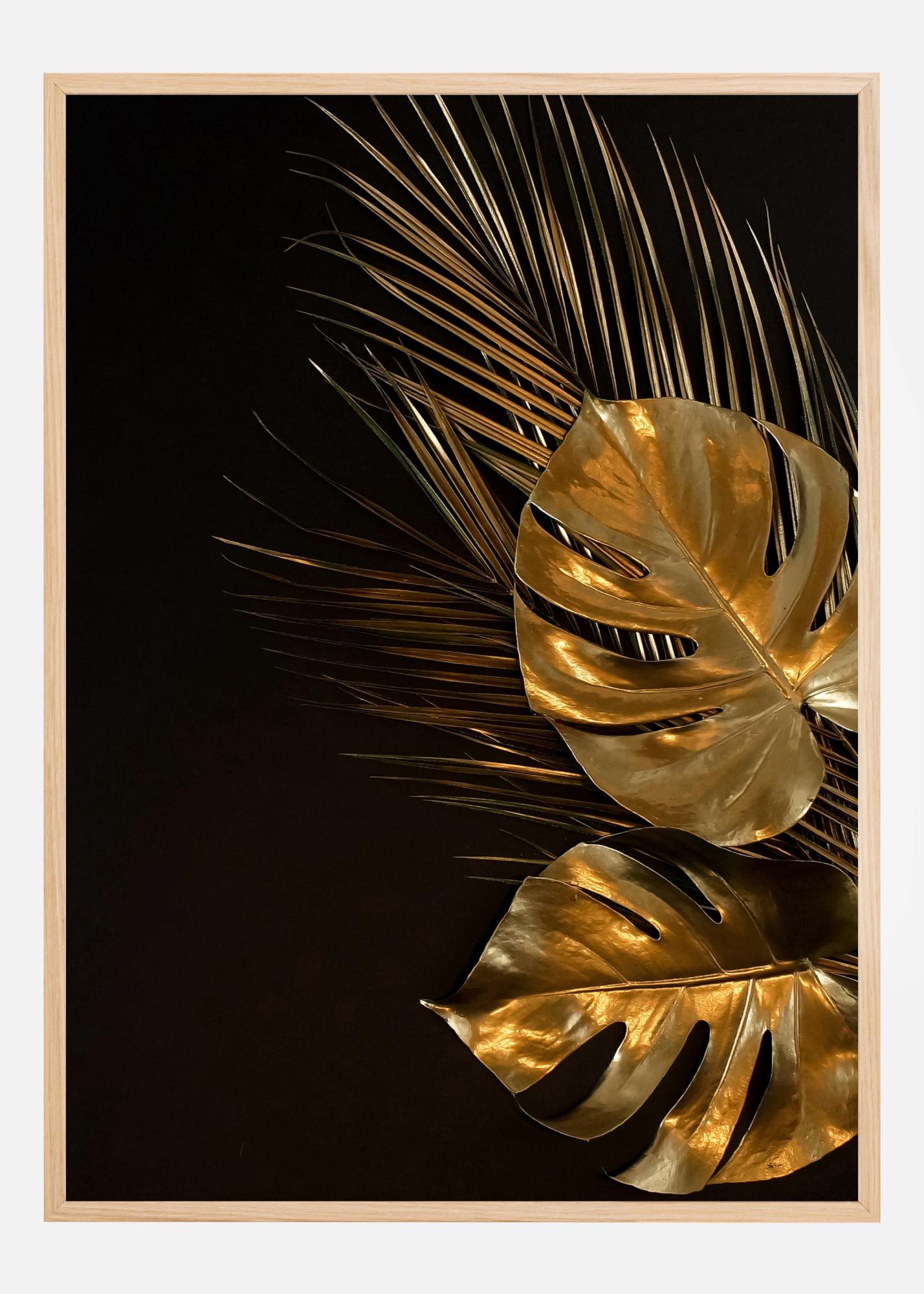 Μια αφίσα φύσης με φωτεινά χρυσαφένια φύλλα σε μαύρο φόντο. Χρυσά φύλλα από Monstera και χρυσαφένια φύλλα φτέρης γεμίζουν αυτή την εκπληκτική εικόνα. Η λάμψη του χρυσού δημιουργεί μια λάμψη που, παρά το μαύρο φόντο, φωτίζει το δωμάτιο με μια κομψή, αλλά και εορταστική αίσθηση.