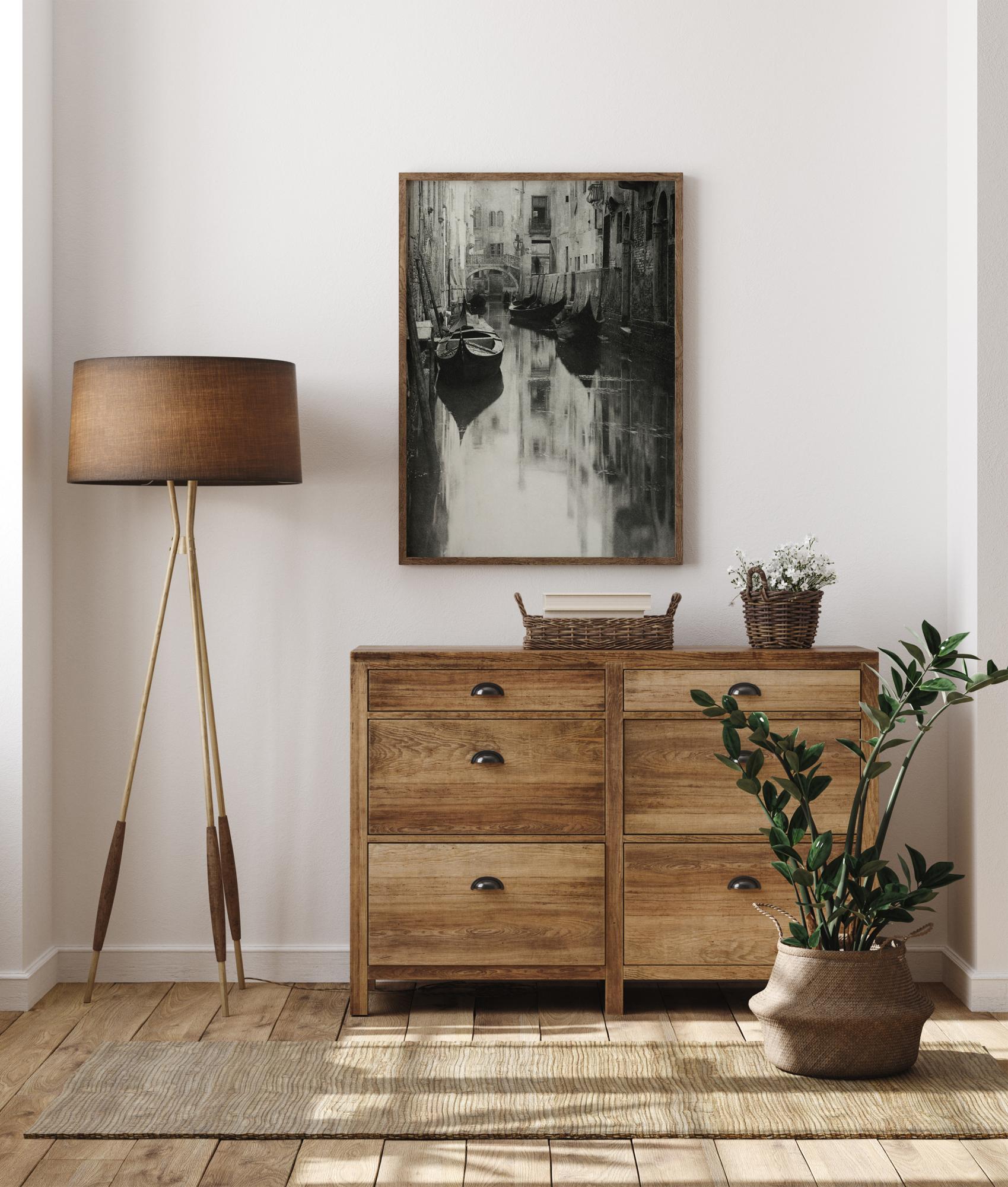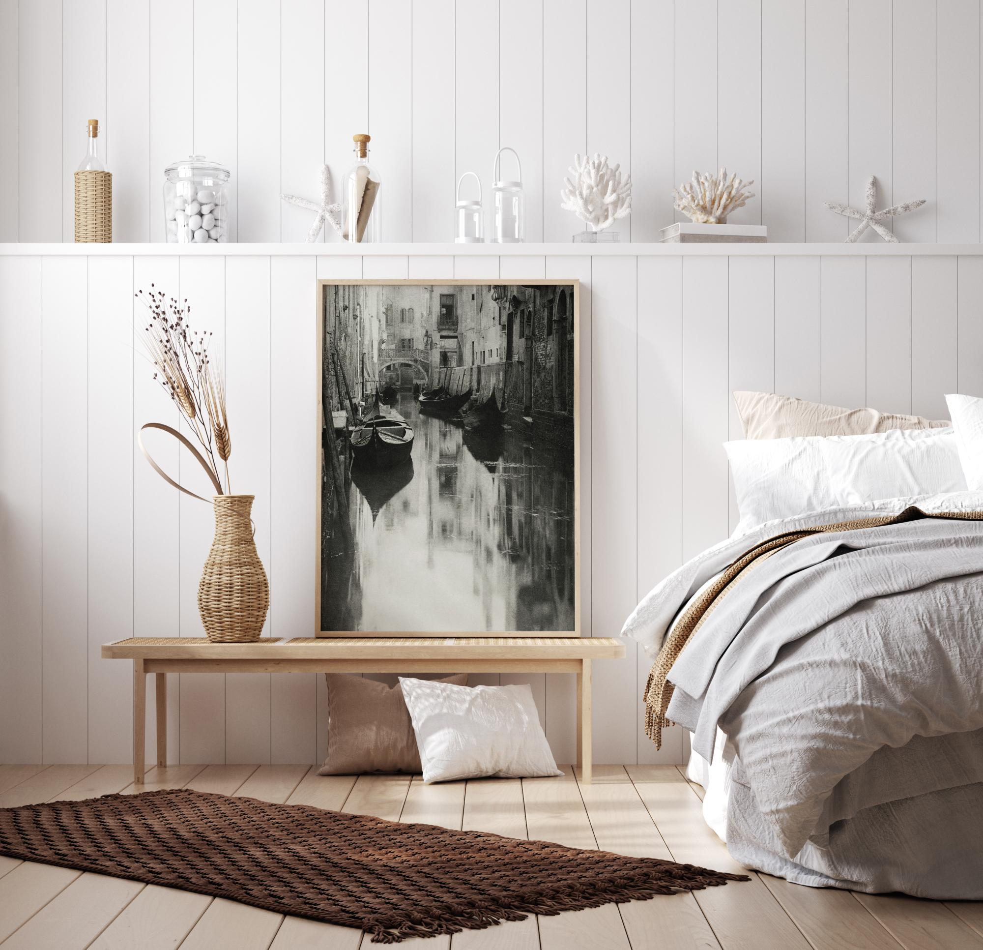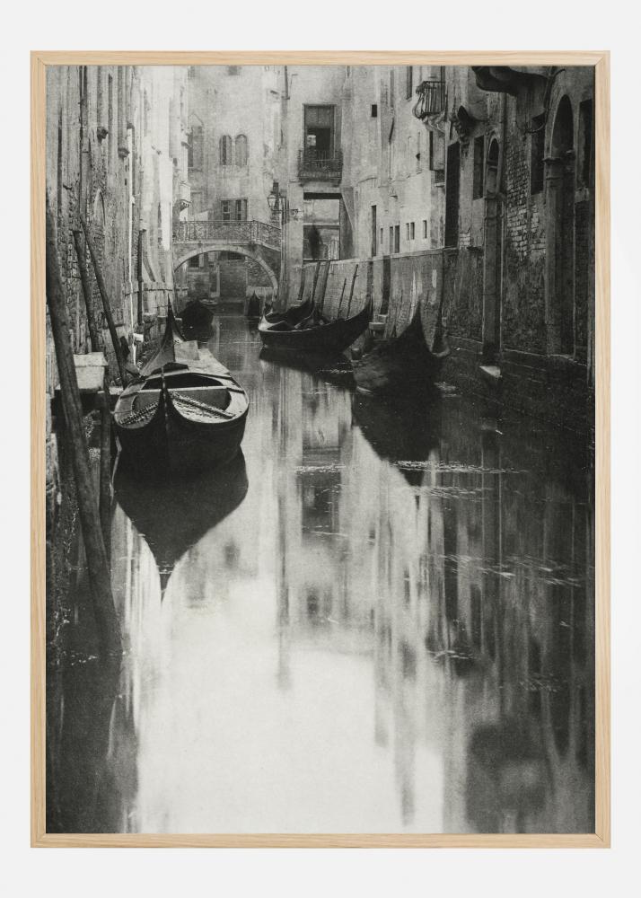 Μία ασπρόμαυρη αφίσα με γόνδολες δεμένες σε ένα κανάλι στη Βενετία. Οι βάρκες βρίσκονται ακίνητες στα ήρεμα νερά δίπλα στις απότομες πλευρές των σπιτιών. Η εικόνα εκπέμπει ηρεμία και γαλήνη σε αυτό το απομακρυσμένο μέρος της πόλης.