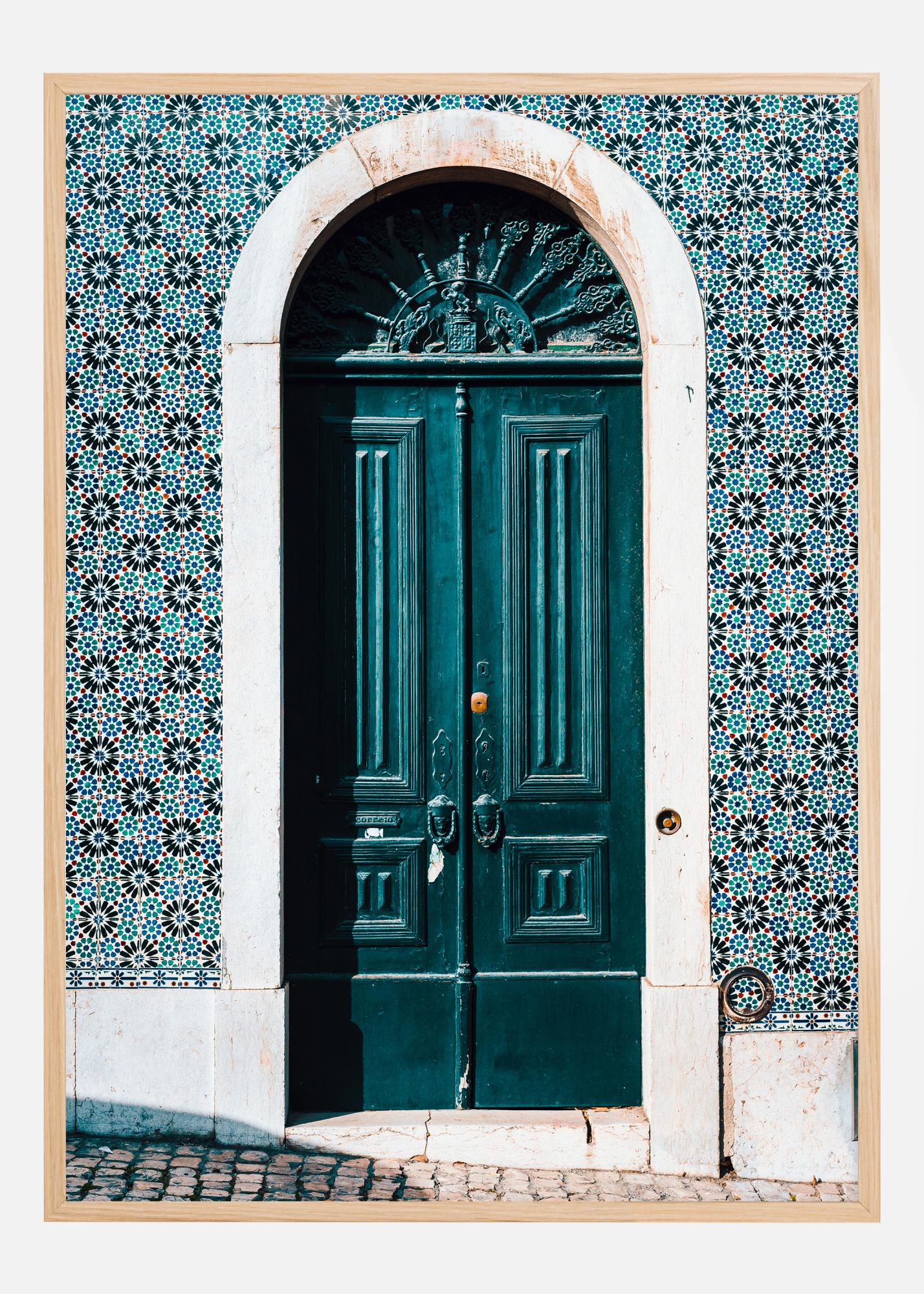 Αυτή η κομψή αφίσα απεικονίζει μια επιβλητική πράσινη πόρτα, που είναι όμορφα πλαισιωμένη από παραδοσιακά, λεπτομερή κεραμικά πλακάκια σε μπλε και λευκό. Ο κλασικός σχεδιασμός και το τολμηρό χρώμα της πόρτας αντιπαρατίθεται με τα περίπλοκα μοτίβα, δημιουργώντας μια αίσθηση καλωσορίσματος και πολιτιστικού πλούτου. Η εικόνα μεταδίδει την αίσθηση μιας φιλόξενης εισόδου σε ένα σπίτι γεμάτο ιστορία και χαρακτήρα.