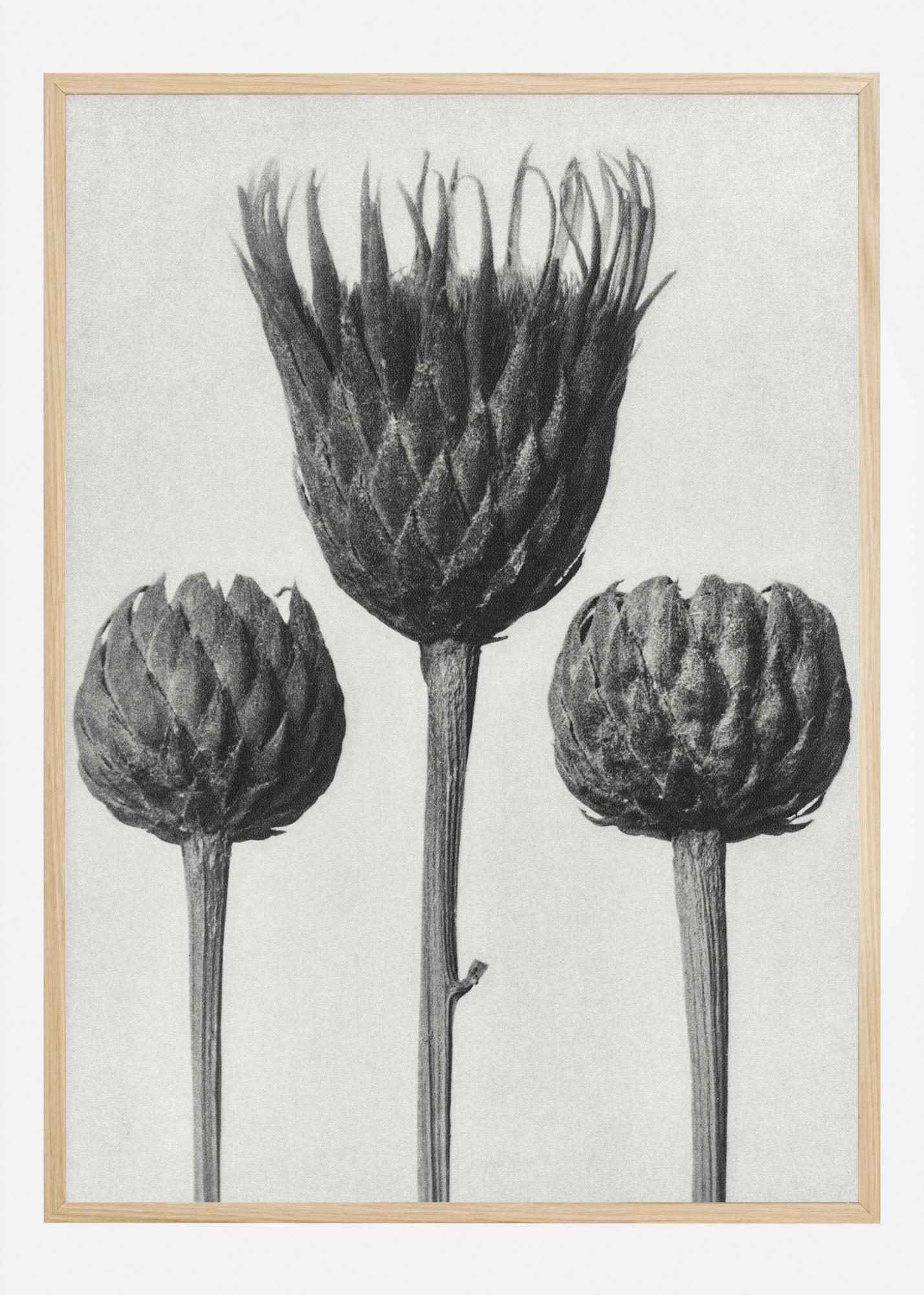 Μια αφίσα φύσης με τρία γκρι λουλούδια με ένα μόνο στέλεχος. Τα τρία γκρι λουλούδια στέκονται ψηλά σε λευκό φόντο και είναι τοποθετημένα σχεδόν δίπλα-δίπλα. Το γκρι λουλούδι στο προσκήνιο έχει ανοίξει περισσότερο από τα μικρότερα λουλούδια. Αυτή είναι η τέλεια εκτύπωση για να κρεμάσετε στον χειμερινό σας κήπο.