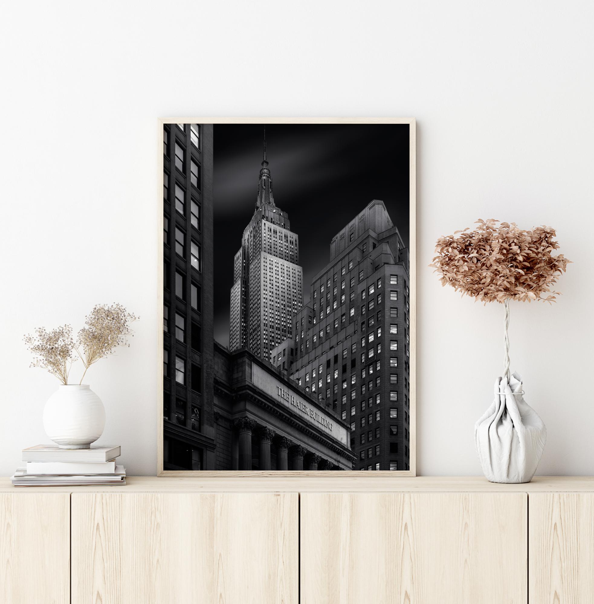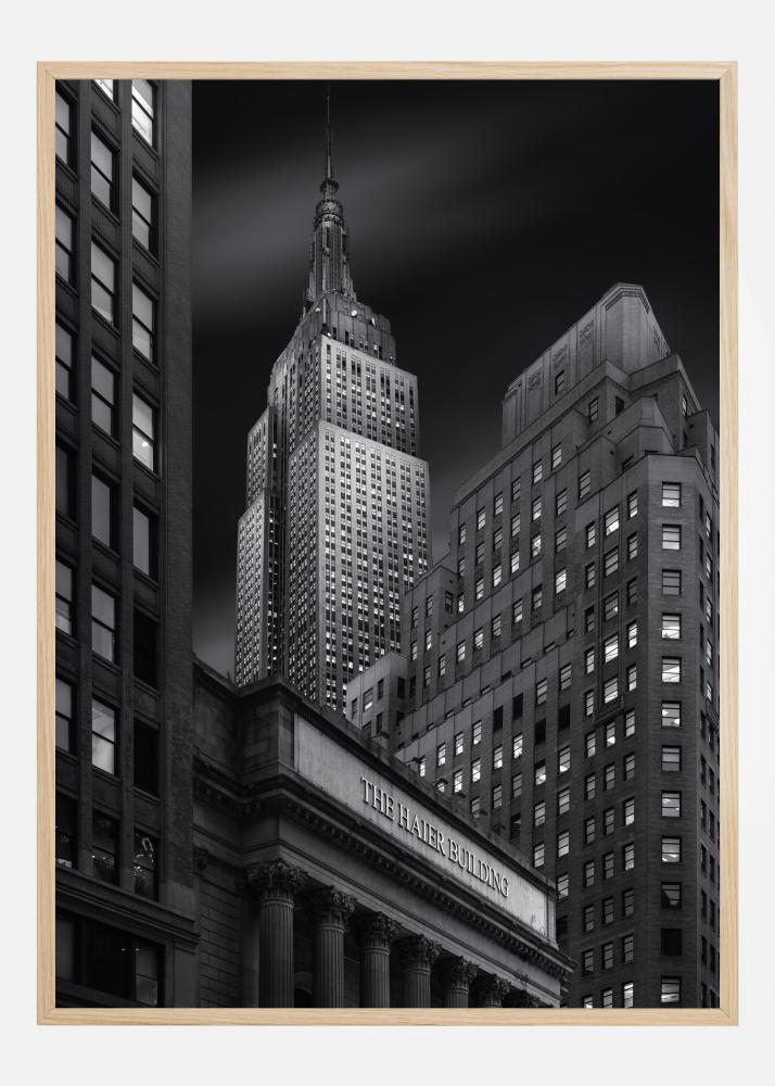 Μια αφίσα με το κτίριο Haier στη Νέα Υόρκη τη νύχτα. Τα φωτεινά χρυσαφένια γράμματα του κτιρίου φωτίζουν και γράφουν "The Haier Building". Με τα κτίρια απέναντι από μια μαύρη αστική όψη, αυτή είναι μια πολύ εντυπωσιακή εικόνα. Αυτή η δραματική ασπρόμαυρη αφίσα της εσωτερικής πόλης της Νέας Υόρκης είναι τέλεια σε έναν λευκό τοίχο.