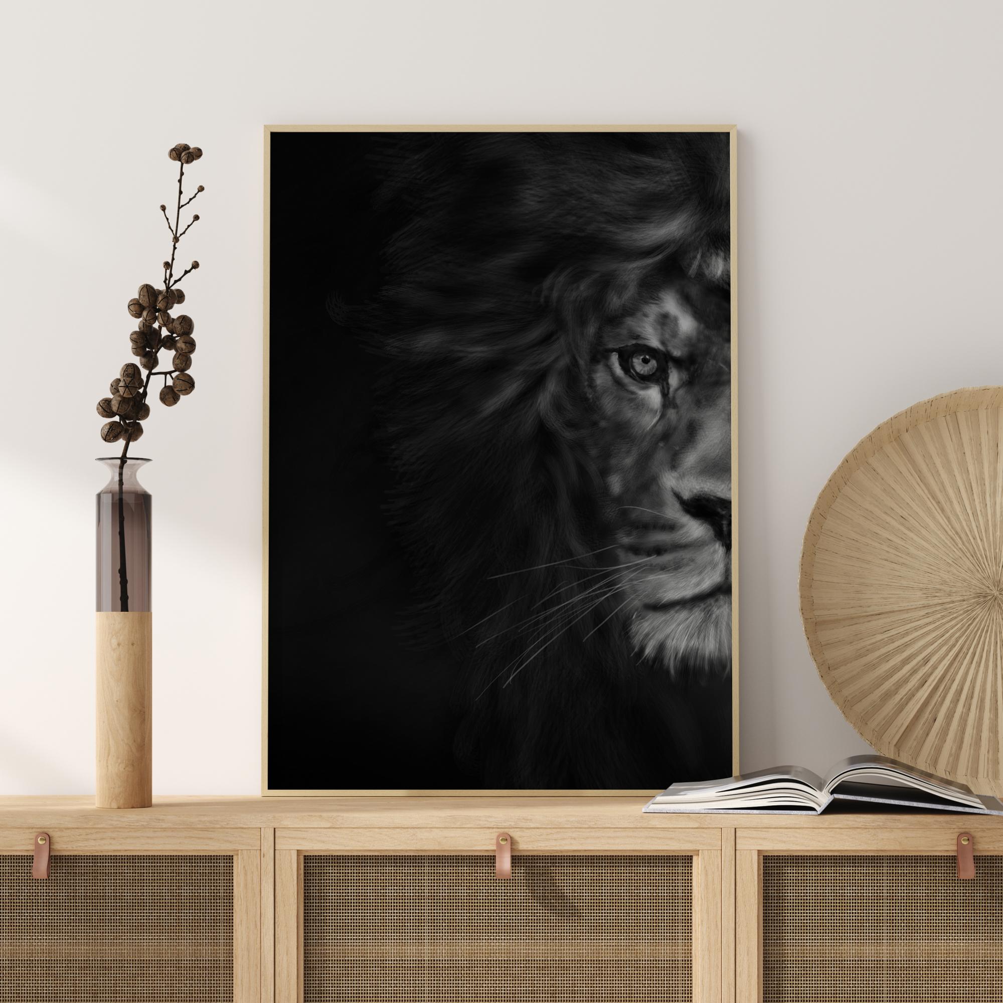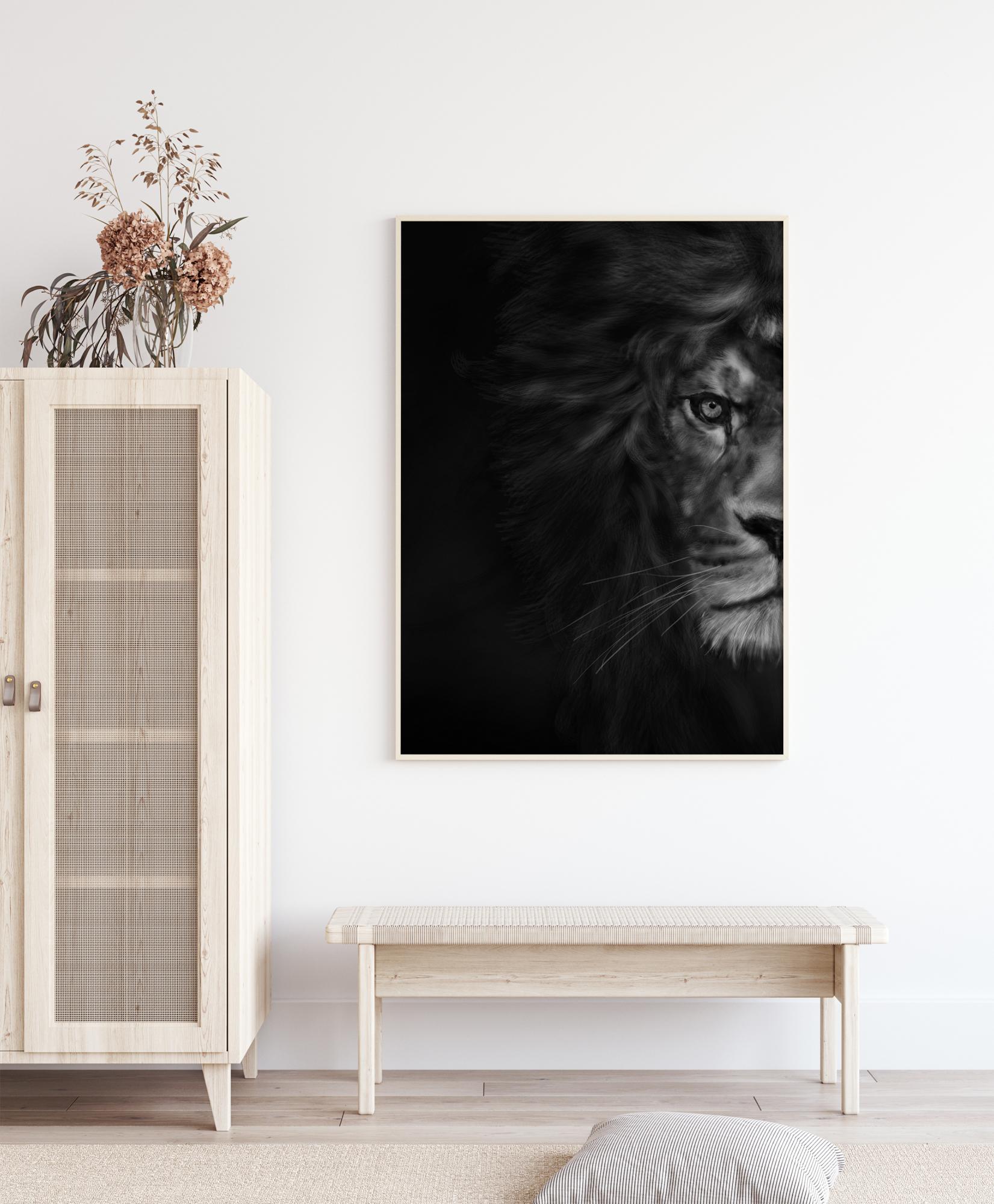 Μια εντυπωσιακή ασπρόμαυρη αφίσα φύσης με ένα άγριο λιοντάρι που κοιτάζει κατευθείαν στην κάμερα. Τοποθετημένο στα δεξιά της εκτύπωσης φαίνεται μόνο το μισό πρόσωπο του λιονταριού. Με την όμορφη κυματιστή χαίτη του και τη μεγαλοπρεπή πόζα του μπορεί σίγουρα να οριστεί ως ο βασιλιάς της ζούγκλας. Φέρτε την αίσθηση σαφάρι στο σπίτι σας.