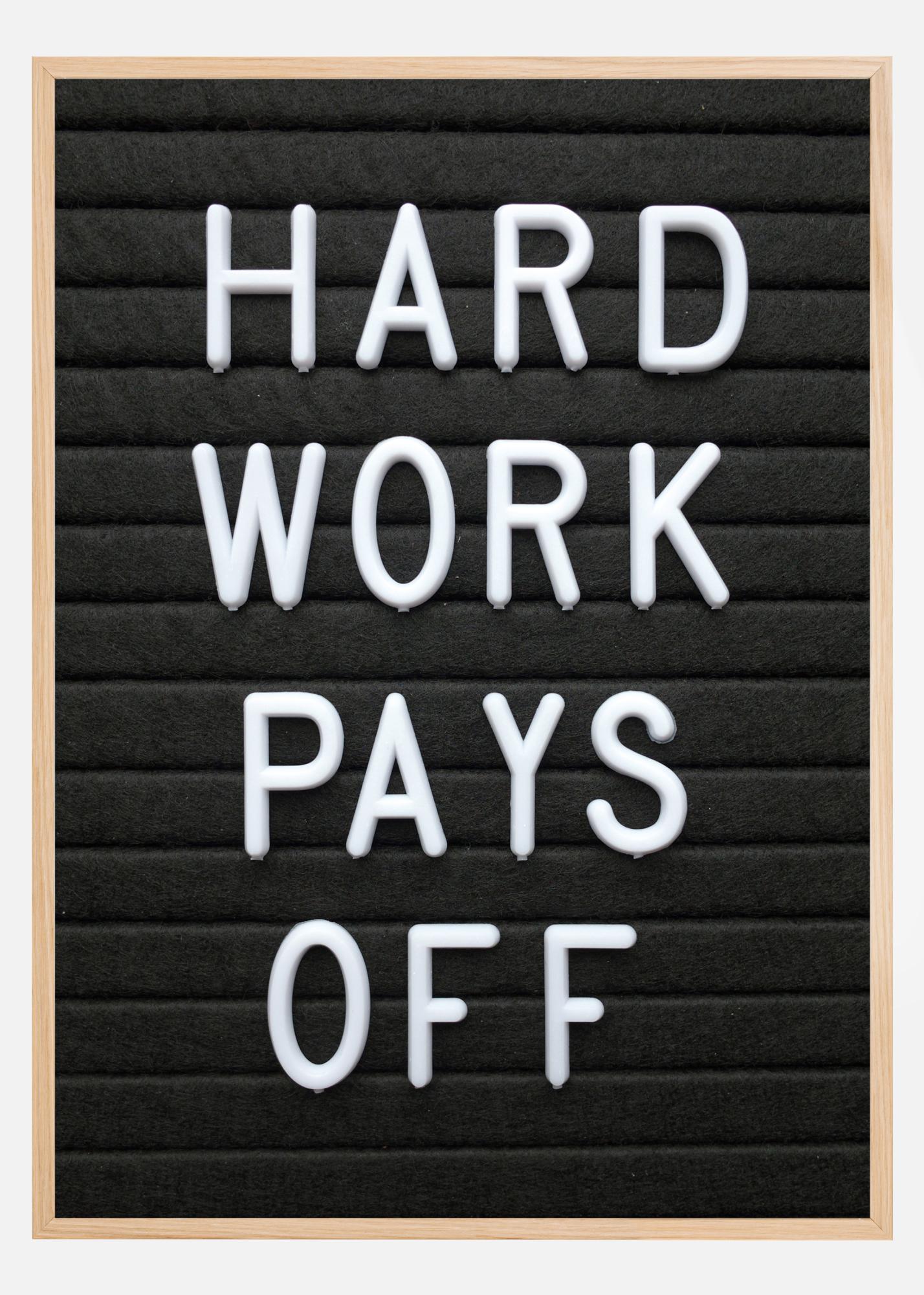 Μια απλή αλλά αποτελεσματική αφίσα με τις λέξεις "Η σκληρή δουλειά αποδίδει". Λευκά μεγάλα γράμματα σε μαύρο φόντο δίνουν ένα πολύ ισχυρό μήνυμα σε αυτόν που βλέπει την εικόνα. Μια τέλεια αφίσα για να κρεμάσετε σε έναν λευκό τοίχο σε έναν εργασιακό χώρο.
