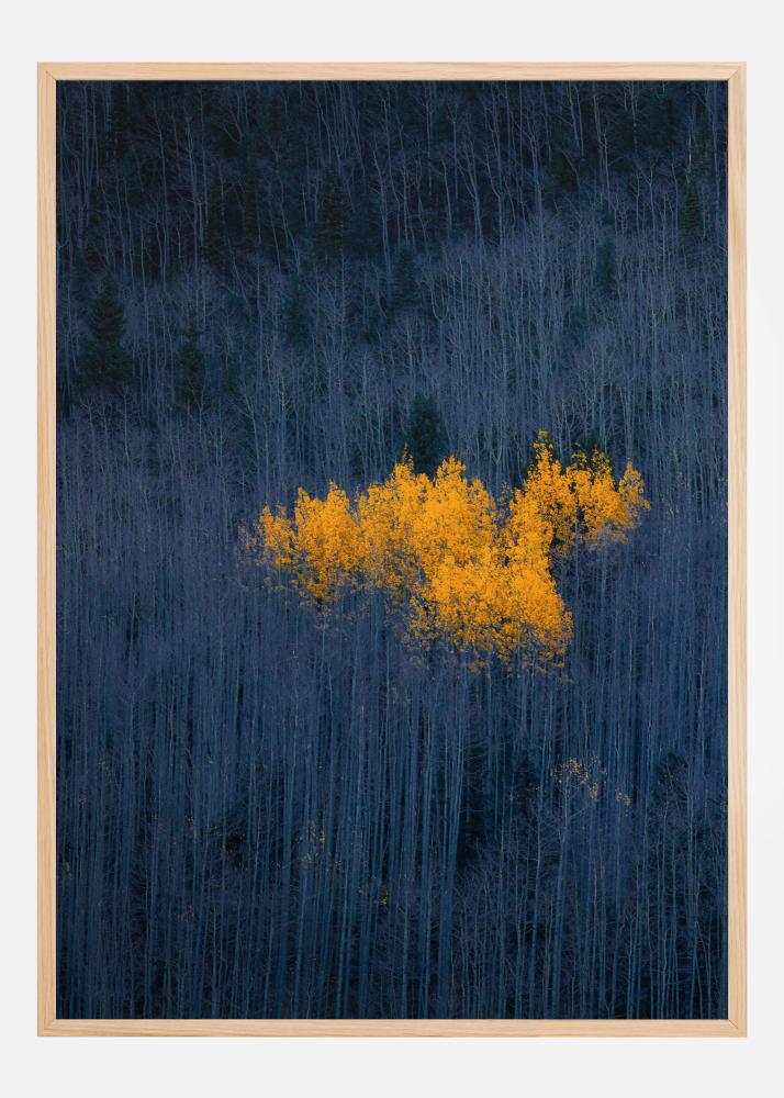 Μια φανταστική αφίσα που απεικονίζει ένα δέντρο σε σκούρο πράσινο και μπλε του μεσονυχτίου. Στη μέση της εκτύπωσης, οι κορυφές των δέντρων έχουν τονιστεί με κίτρινο, δίνοντας στην εκτύπωση λίγο χρώμα. Ένα όμορφο εκτύπωμα για να κρεμάσετε σε ένα σαλόνι για να δημιουργήσετε μια χαλαρωτική ατμόσφαιρα.