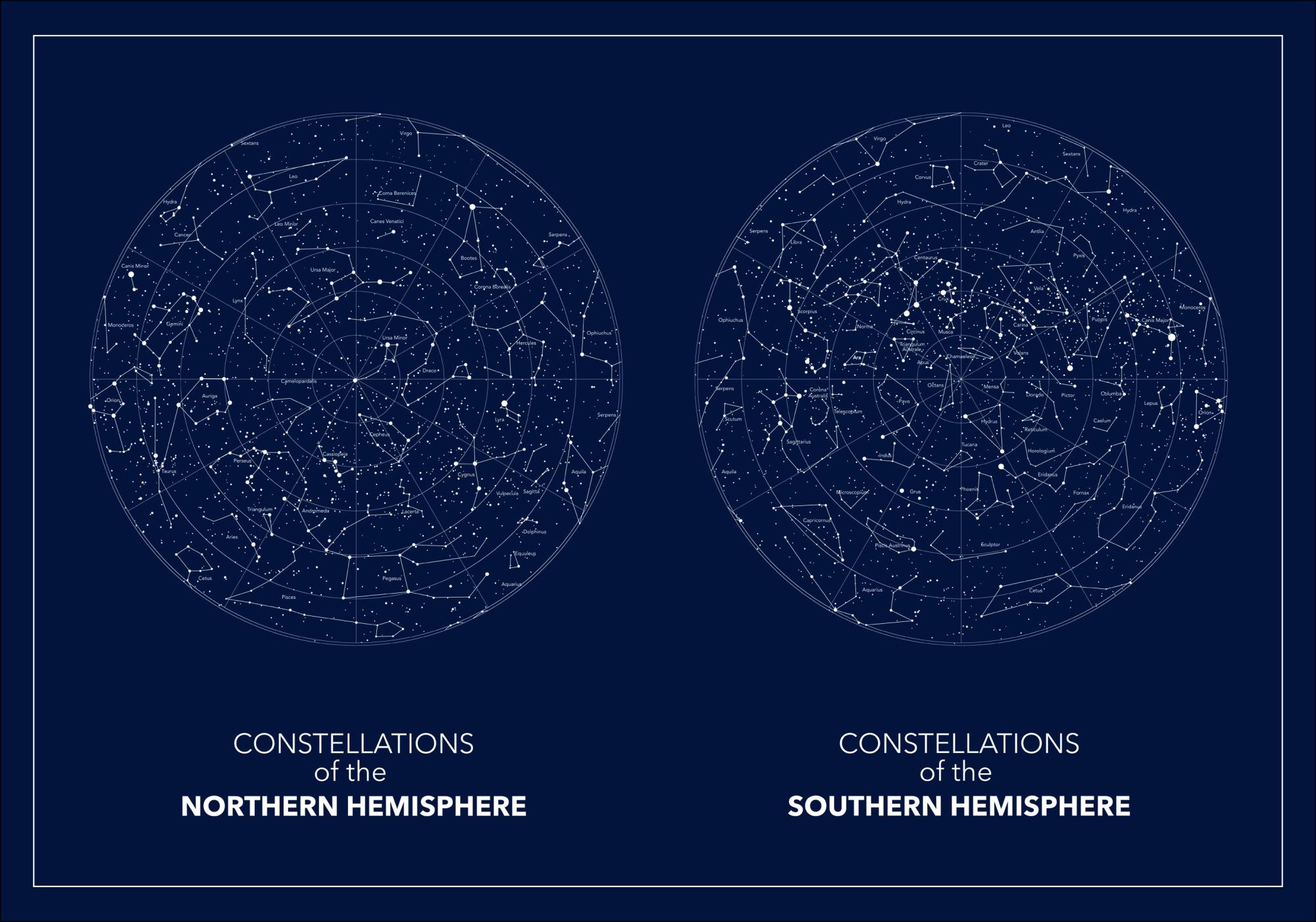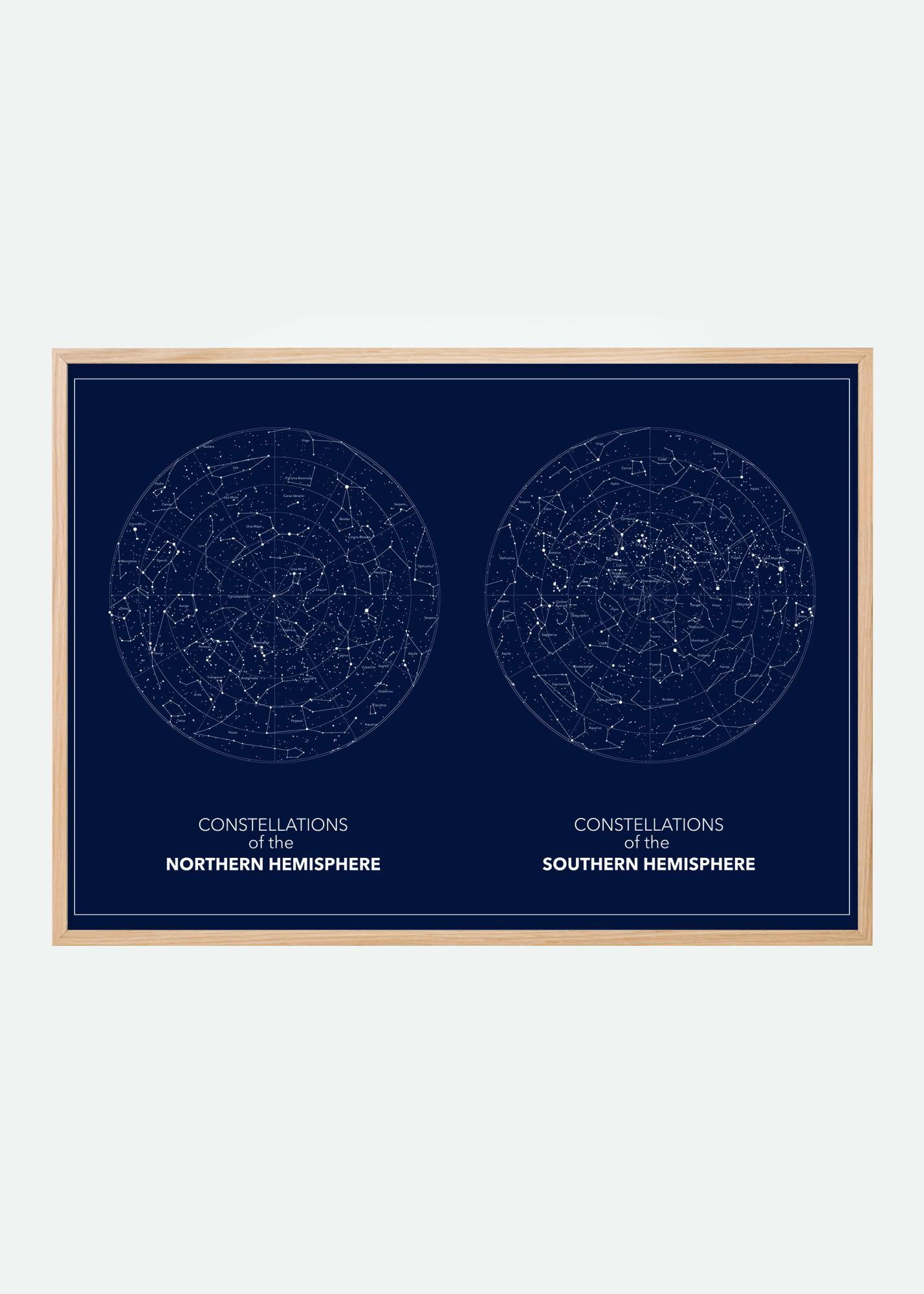 Μια συναρπαστική σκούρα μπλε αφίσα με τον βόρειο και νότιο έναστρο ουρανό. Και οι δύο εικόνες τοποθετούνται δίπλα-δίπλα. Τοποθετημένοι σε σκούρο μπλε φόντο, οι αστερισμοί είναι απαλά περιγραμμένοι με λευκό. Κρεμάστε αυτήν την εικόνα στο γραφείο σας για να δημιουργήσετε μια αίσθηση απειρότητας.