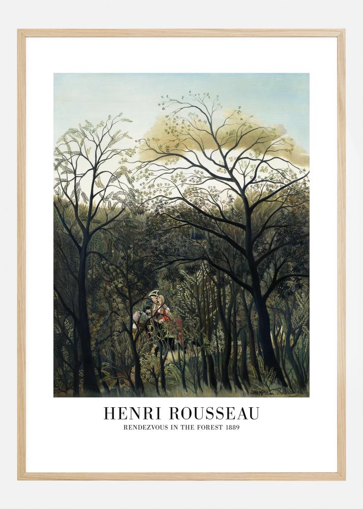 Αυτή η μαγευτική αφίσα, με τίτλο "Συνάντηση στο Δάσος" από το 1889, είναι έργο του Ανρί Ρουσώ που απεικονίζει μια μυστική συνάντηση στο καταπράσινο δάσος. Ιδανική για όποιον αναζητά μια καλλιτεχνική εκτύπωση που είναι κλασική και μυστηριώδης, η εικόνα παρουσιάζει μια ασυνήθιστη σκηνή όπου μια φιγούρα με κόκκινο ένδυμα φαίνεται να συγχωνεύεται με την περιβάλλουσα βλάστηση. Τα κύρια χρώματα σε αυτό το κομμάτι είναι μια συμφωνία του πράσινου, που κυμαίνεται από βαθύ βρύο μέχρι απαλά, ανοιχτά χρώματα που αλληλοσυμπληρώνονται και προσδίδουν μια αίσθηση βάθους και διάστασης στο δασικό περιβάλλον. Αέρινοι τόνοι του μπεζ και του μπλε ανοίγουν τον ουρανό και δίνουν την εντύπωση ενός εκτεταμένου τοπίου, που είναι τόσο ειρηνικό όσο και ελκυστικό.