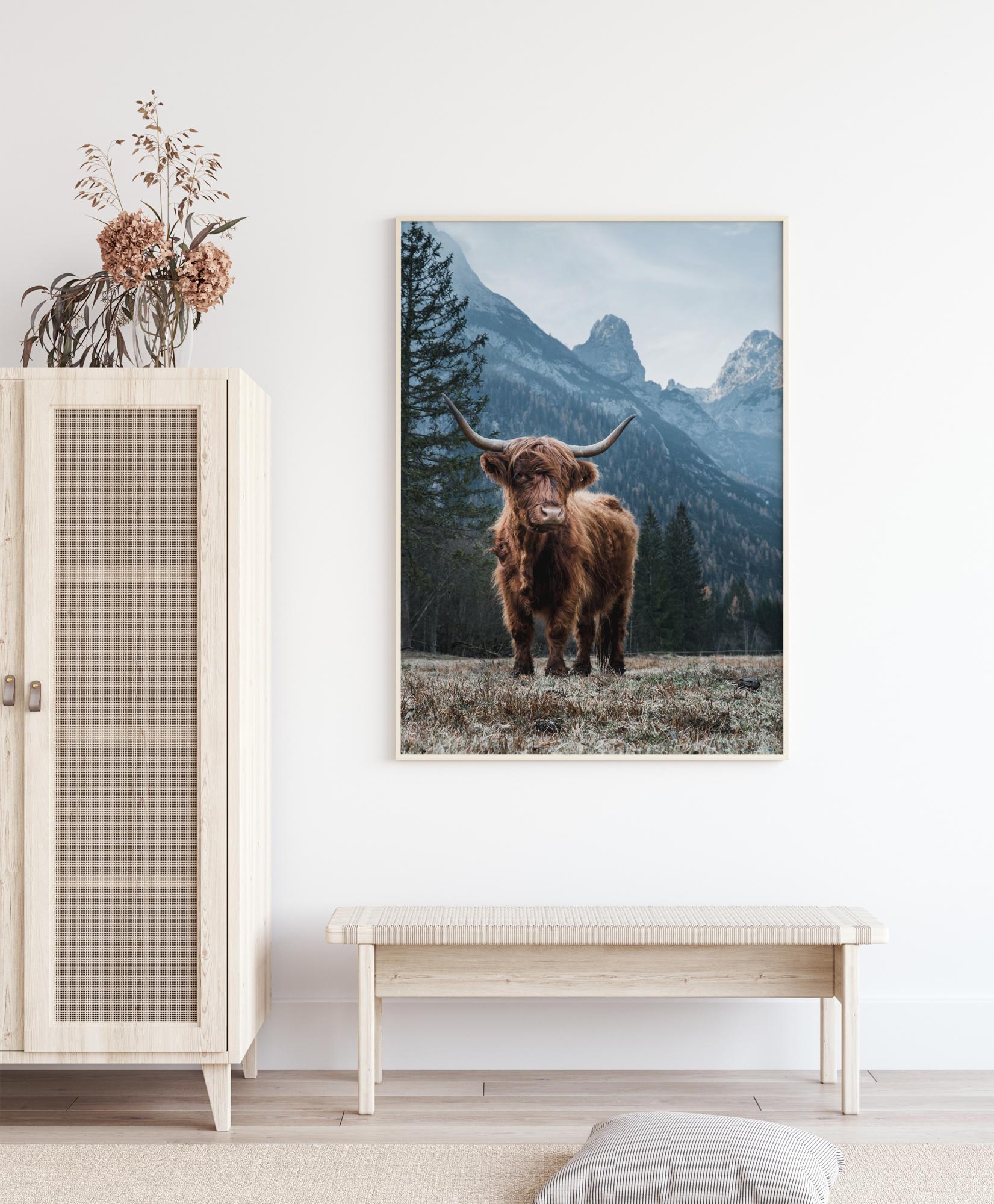 Μια άγρια αφίσα ενός κοκκινωπού καφέ βουνούβου που στέκεται μόνο του σε ένα πεδίο. Τα απότομα βουνά που καλύπτονται με χιόνι πλαισιώνουν αυτό το όμορφο ζώο. Με το κοντό, παχύ τρίχωμά του που αντέχει σκληρές συνθήκες, το ζώο δεν φαίνεται να ενοχλείται από τίποτα. Χρησιμοποιήστε τη φαντασία σας και φανταστείτε ότι βρίσκεστε στα σκωτσέζικα λιβάδια.