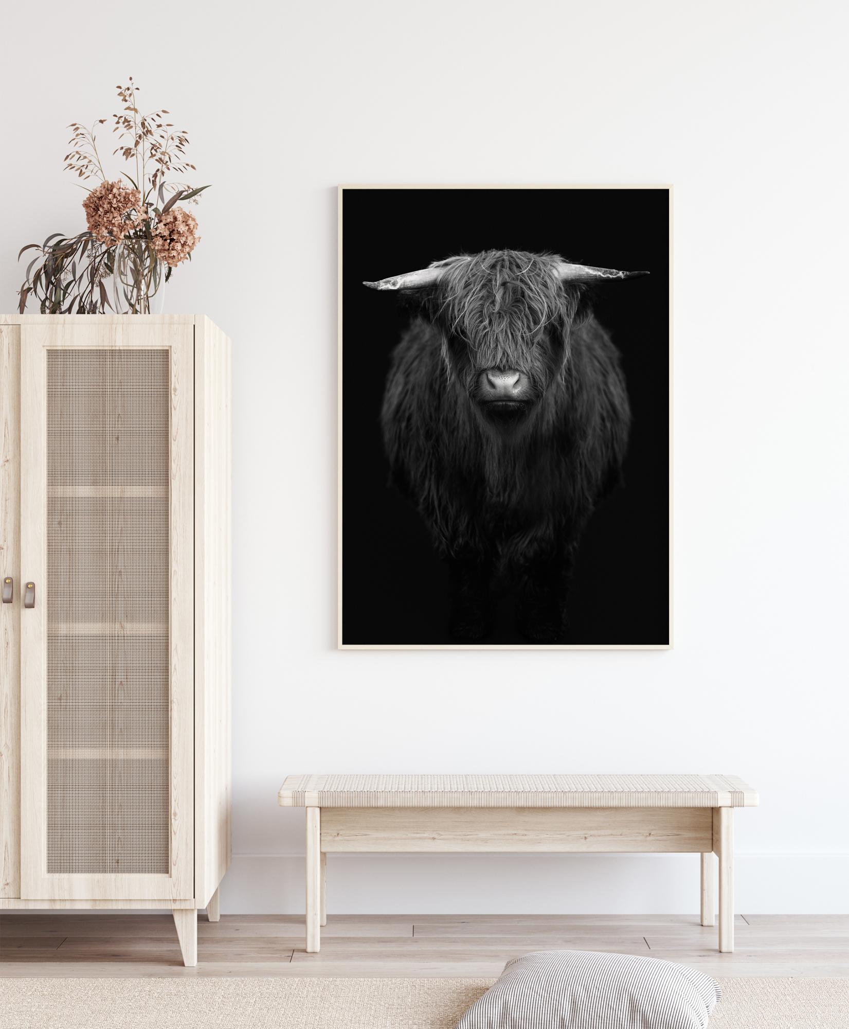 Μια εντυπωσιακή μαύρη αγελάδα των Χάιλαντς σε ένα μαύρο φόντο. Αυτό το όμορφο πλάσμα κοιτάζει κατευθείαν στην κάμερα και επιδεικνύει τη μακριά μαύρη κυματιστή του γούνα. Αν και αυτή η αφίσα είναι μια εικόνα μαύρο σε μαύρο, τα λευκά κέρατα και η μύτη της αγελάδας διακρίνονται καθαρά. Θαυμάστε την ομορφιά αυτού του πλάσματος καθώς κοιτάζει την κάμερα.