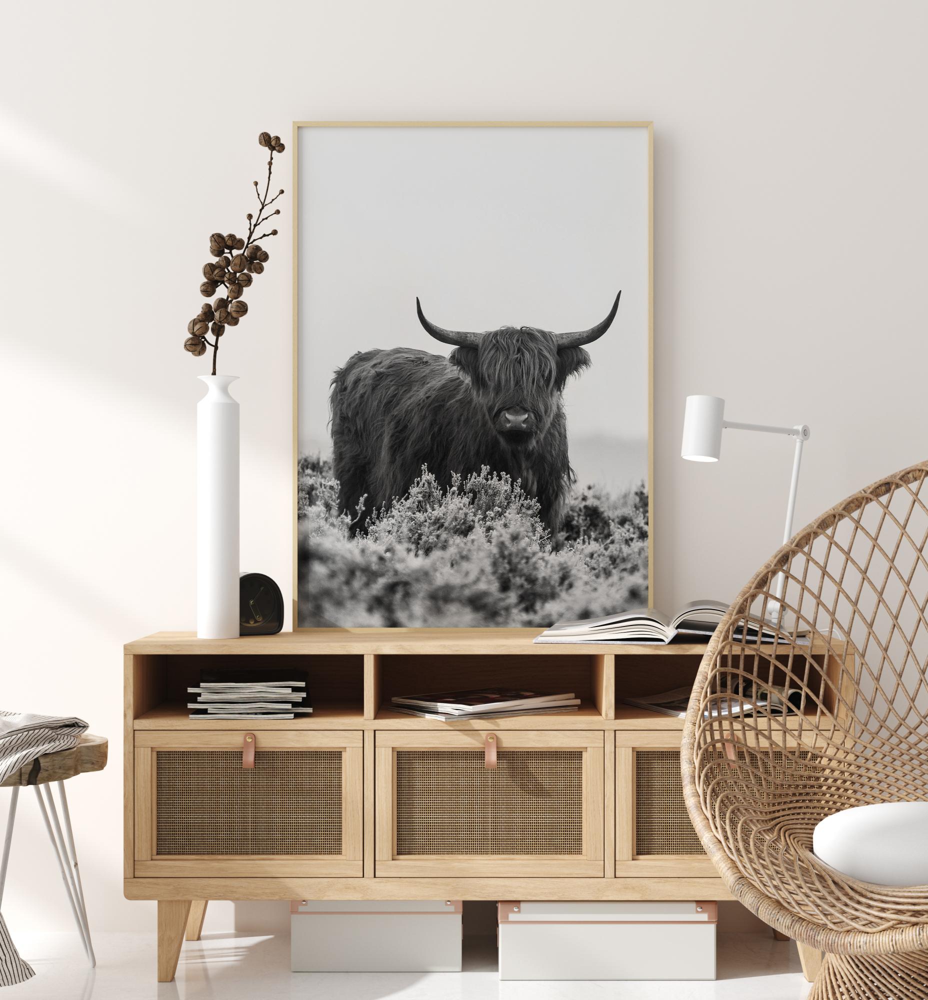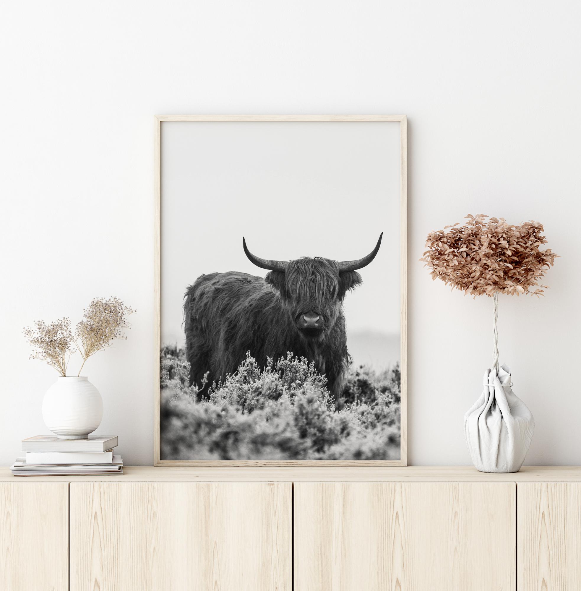 Μια όμορφη αφίσα ζώων που απεικονίζει μια μοναχική αγελάδα στο λιβάδι. Περιτριγυρισμένο από ψηλά χόρτα, αυτό το μεγαλοπρεπές ζώο κοιτάει κατευθείαν στην κάμερα. Όπως στέκεται μπροστά από έναν γκρίζο ουρανό και ψηλά χόρτα, μπορείς σχεδόν να νιώσεις τον κρύο άνεμο στο πρόσωπό σου. Μια τέλεια εικόνα για όλους τους λάτρεις των ζώων.