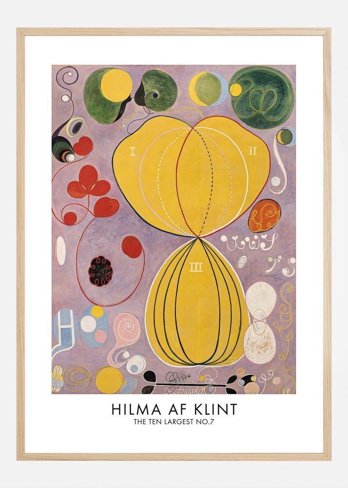 Αυτή η αφίσα, που παρουσιάζει το 'The Ten Largest No.7' από τη Hilma af Klint, είναι μια πραγματική γιορτή για τα μάτια, γεμάτη παιχνιδιάρικες μορφές και τολμηρά χρώματα. Κεντρικό στοιχείο του έργου είναι μια μεγάλη κίτρινη φιγούρα, χωρισμένη σε τρεις ενότητες, περιτριγυρισμένη από μια συμφωνία από καμπύλες, κύκλους και σπείρες σε ένα φάσμα από κόκκινο, πράσινο και μπλε. Οι αφηρημένες μορφές και τα αποκρυφιστικά στοιχεία σε ένα μοβ φόντο κάνουν αυτό το έργο τέχνης μια μυστηριώδη και στοχαστική εμπειρία. Αυτή η εκτύπωση τέχνης προσφέρει έναν μοναδικό συνδυασμό αισθητικής και φιλοσοφίας, που αντικατοπτρίζει τη φιλοδοξία του af Klint να συνδέσει το φυσικό με το πνευματικό.