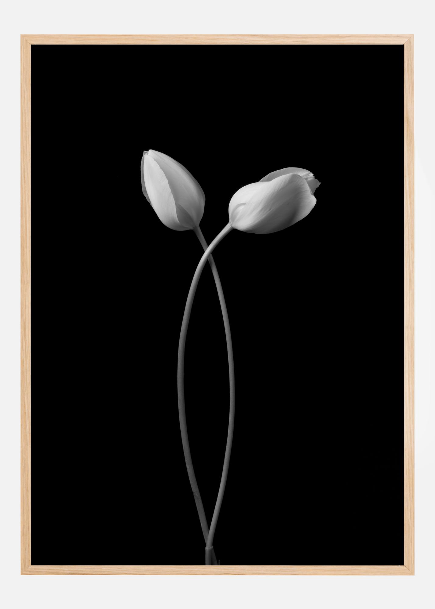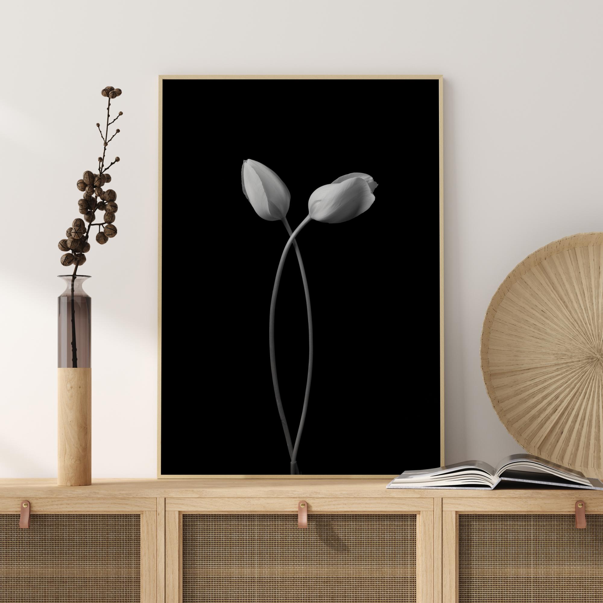 Μια κομψή αφίσα με δύο τουλίπες που αγκαλιάζονται σε ένα απλό μαύρο φόντο. Τοποθετήστε την σε έναν κίτρινο τοίχο για να προσθέσετε χρώμα σε αυτή τη δραματική σκηνή. Νιώστε τη σύνδεση στη φύση με αυτή την αφίσα.