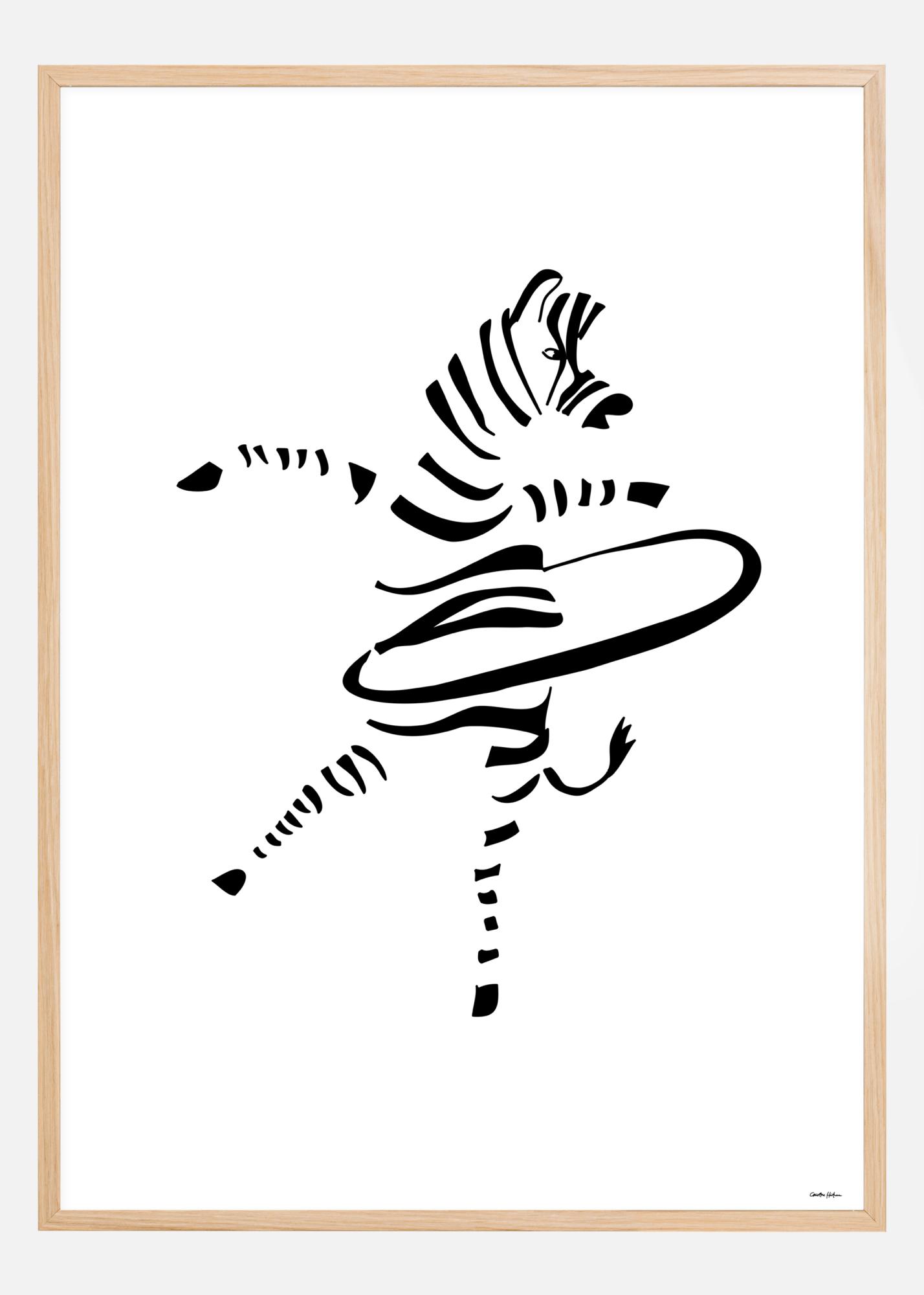 Ένα μινιμαλιστικό πορτρέτο μιας χορεύουσας ζέβρας. Σε ένα λευκό φόντο, οι μαύρες πινελιές σχηματίζουν επιδέξια τη μορφή της ζέβρας. Αυτή η χαριτωμένη ζέβρα στέκεται στα πίσω πόδια της και χορεύει με ένα στεφάνι. Αφίσα απλή αλλά διασκεδαστική για να κρεμαστεί σε έναν απλό τοίχο.