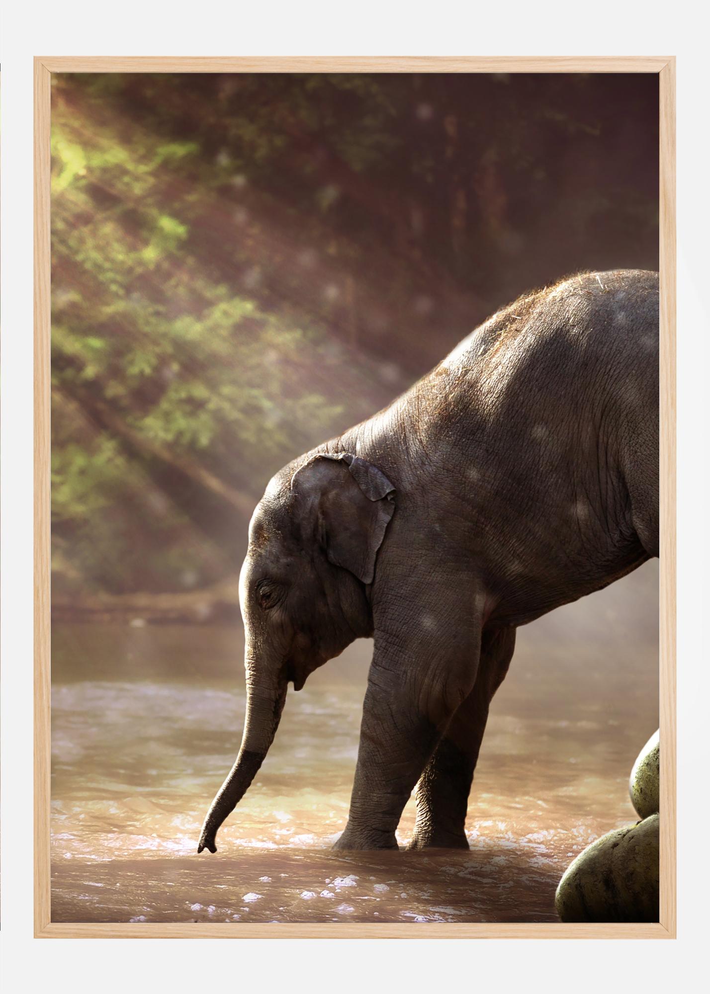 Μια γλυκιά φωτογραφία ενός μικρού ελέφαντα που ενθαρρύνεται από τη μητέρα του να κατέβει στο ποτάμι. Το φως της ημέρας φωτίζει μέσα από τα δέντρα και αντανακλάται στο νερό, δημιουργώντας μια αίσθηση ζεστασιάς. Ο μικρός ελέφαντας διστάζει να κατέβει στο νερό, αλλά η μητέρα βοηθά απαλά. Αυτή η γλυκιά αφίσα αντικατοπτρίζει την έντονη αγάπη μεταξύ μητέρας και παιδιού.