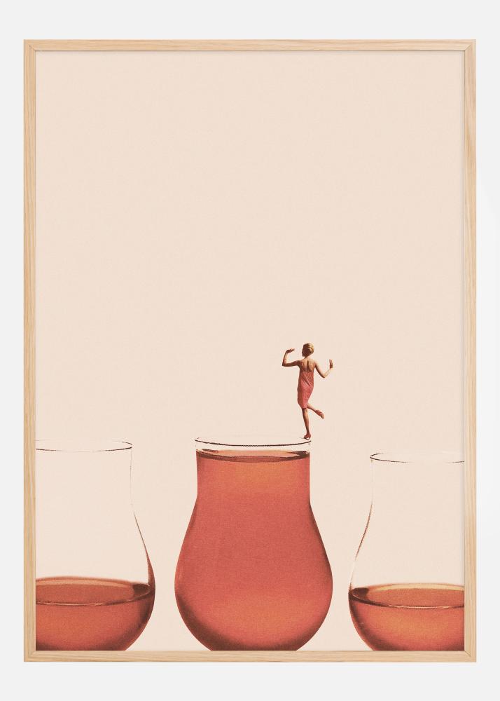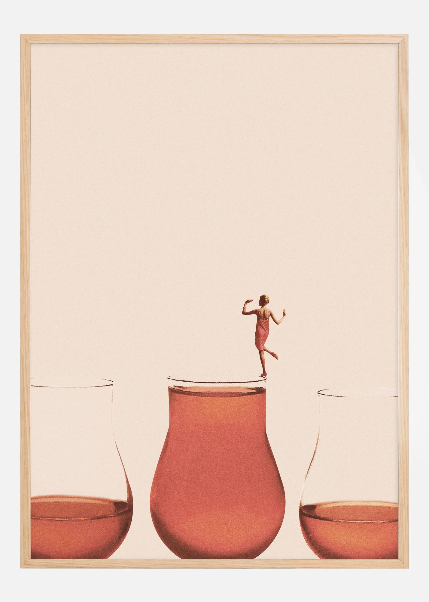 Αυτή η καλλιεργημένη και αισθητικά ευχάριστη αφίσα απεικονίζει μια γυναικεία φιγούρα που εκτελεί μια λεπτή πράξη ισορροπίας πάνω από το χείλος ενός γεμάτου ποτηριού κρασιού. Η γυναίκα, ντυμένη με ένα φόρεμα, φαίνεται να χορεύει ή να κινείται με έναν ευγενή τρόπο, μια εικόνα ελέγχου και ακρίβειας σε μια πράξη που μπορεί να φαίνεται επικίνδυνη. Η σιλουέτα της αναδεικνύεται σχεδόν σαν μια μεταφορά για την λεπτή προσέγγιση που απαιτείται για να απολαύσει κανείς τα λεπτότερα πράγματα της ζωής, με μια ισορροπημένη εκτίμηση για το πλήρες και το κενό.