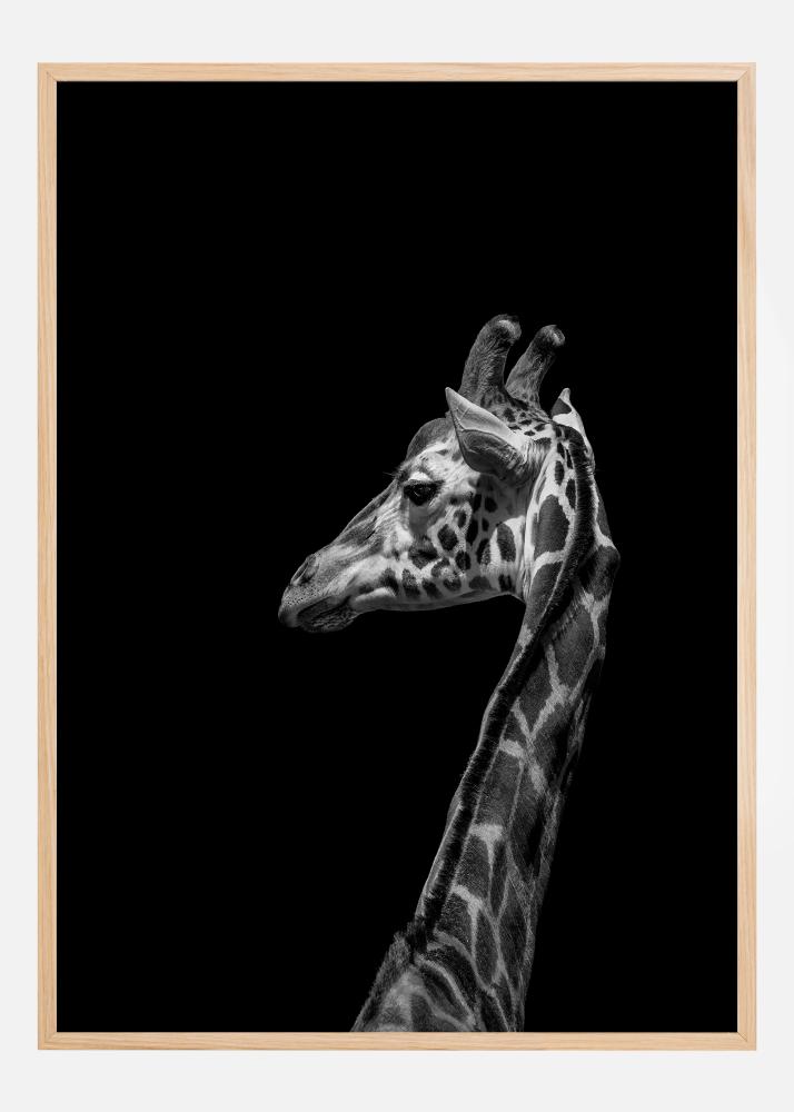 Αυτή η τολμηρή και εκφραστική αφίσα παρουσιάζει μια επιβλητική καμηλοπάρδαλη σε ένα απόλυτο μαύρο φόντο, δημιουργώντας μια δραματική αντίθεση που αιχμαλωτίζει το βλέμμα του θεατή. Το μοναδικό μοτίβο της καμηλοπάρδαλης σε κλίμακα του γκρι έχει αποτυπωθεί επιδέξια, με κάθε κηλίδα και γραμμή να αναδεικνύεται με λεπτομέρεια. Η λεπτομέρεια στην υφή του δέρματος της καμηλοπάρδαλης και οι απαλές αποχρώσεις του γκρι στο μαύρο φόντο προσδίδουν σχεδόν μια τρισδιάστατη επίδραση.