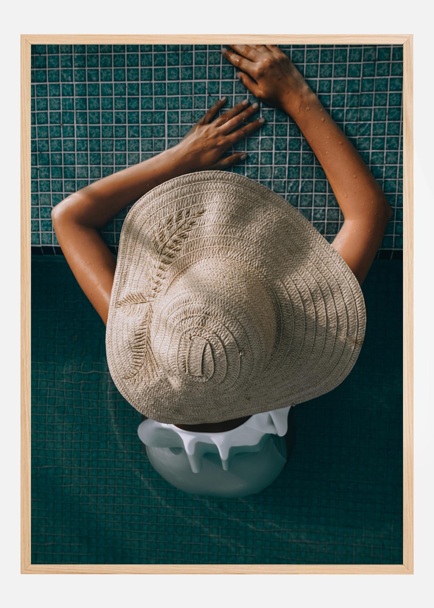 Αυτή η χαλαρωτική και κομψή αφίσα απαθανατίζει μια γαλήνια στιγμή στην πισίνα, όπου ένα άτομο φορά καπέλο με φαρδύ γείσο που αναπαύεται στην άκρη του νερού. Η μοναδική θέα από ψηλά και το χαλαρωτικό μπλε μωσαϊκό στο παρασκήνιο προσφέρουν μια αίσθηση πολυτελούς ευκολίας και φινέτσας. Αυτή η εκτύπωση είναι μια υπέροχη διακοσμητική λεπτομέρεια για να δημιουργήσετε μια όαση ηρεμίας και χαλάρωσης στο σπίτι σας.