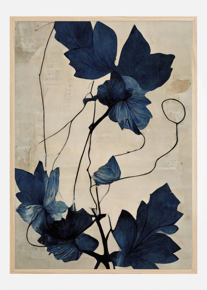 Αυτή η αφίσα αποτυπώνει μια συναρπαστική βοτανική ομορφιά με την λεπτομερή και ρεαλιστική απεικόνιση των λουλουδιών σε βαθύ ινδικό μπλε χρώμα. Τα έντονα και σκοτεινά χρώματα των φύλλων και των λουλουδιών δημιουργούν αντίθεση με ένα φόντο που μοιάζει με παλαιωμένο χαρτί, προσδίδοντας μια αίσθηση αρχαιοπρέπειας και διαχρονικότητας. Αυτή η εκτύπωση είναι ένας φόρος τιμής στην κλασική βοτανική εικονογράφηση και προσδίδει μια κομψή και εκλεπτυσμένη εντύπωση, σε όποιο δωμάτιο κι αν τοποθετηθεί.
